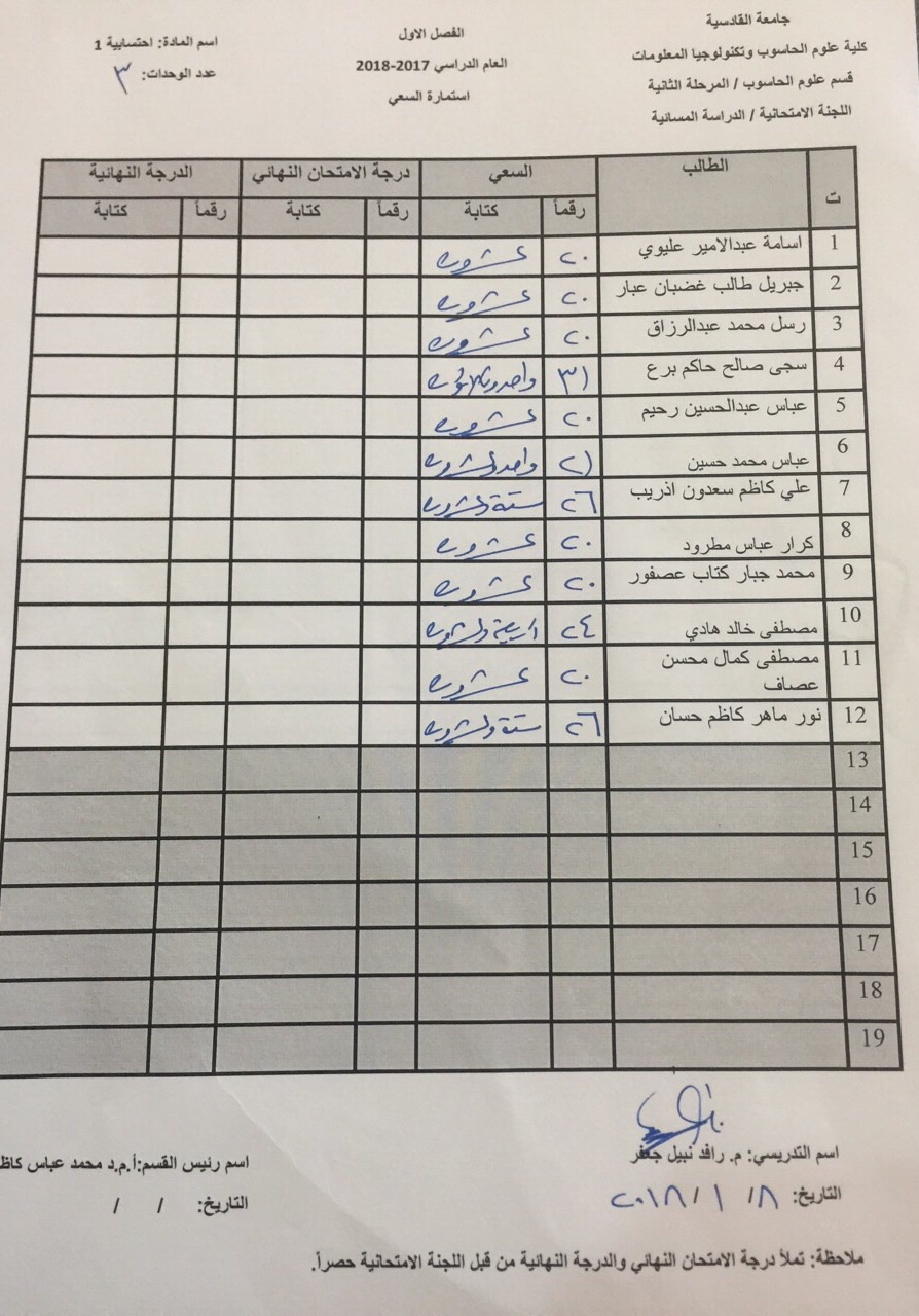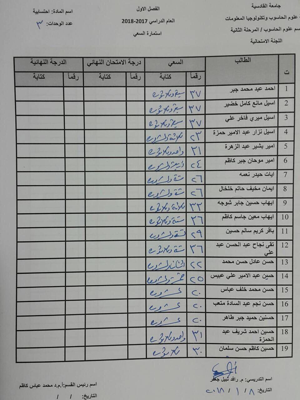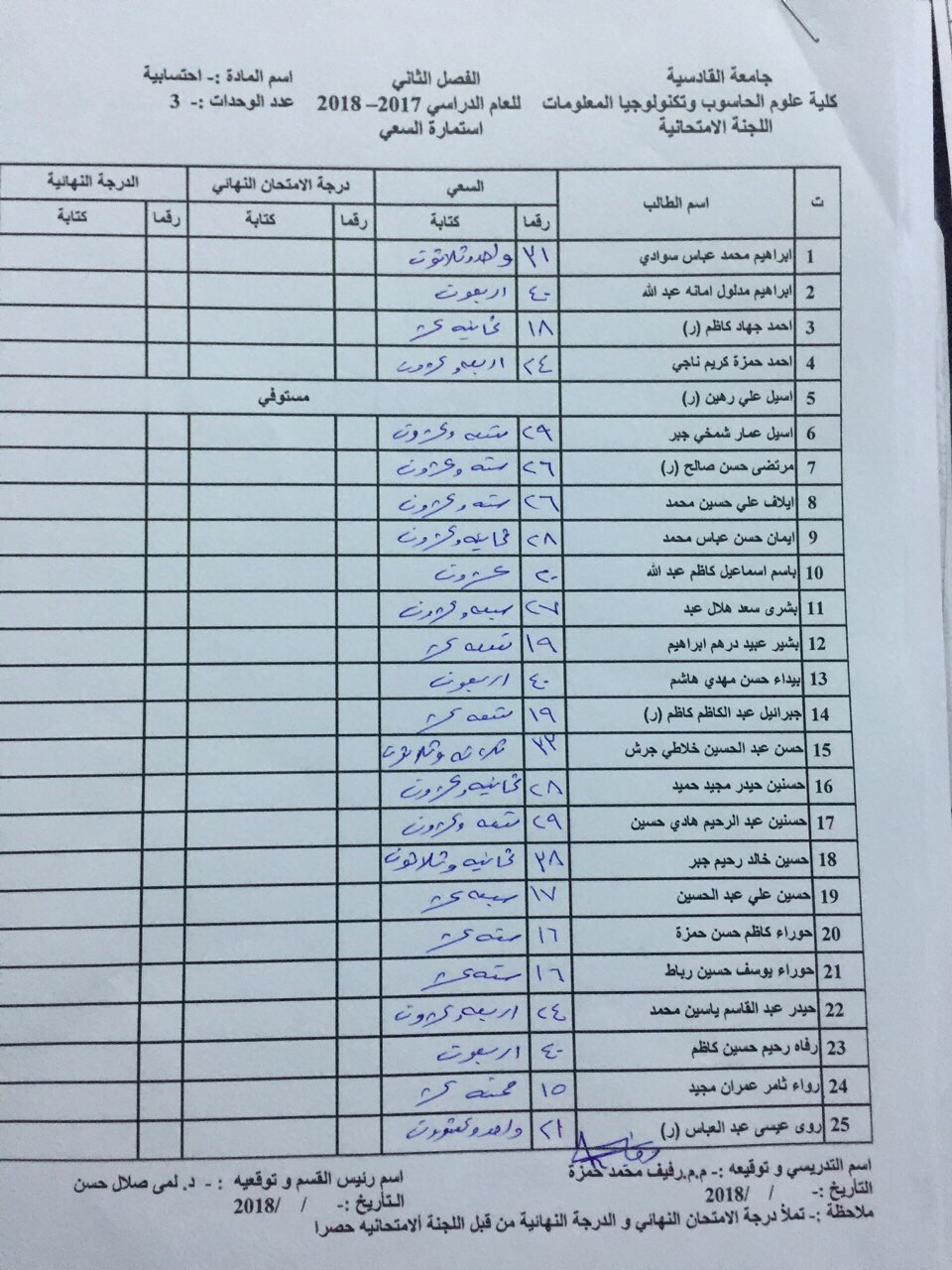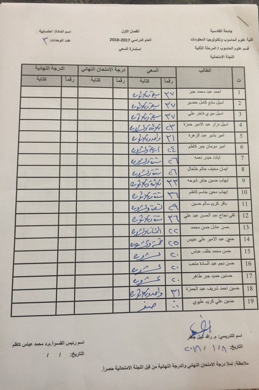 درجات السعي السنوي لمادة احسابية لجميع الاقسام