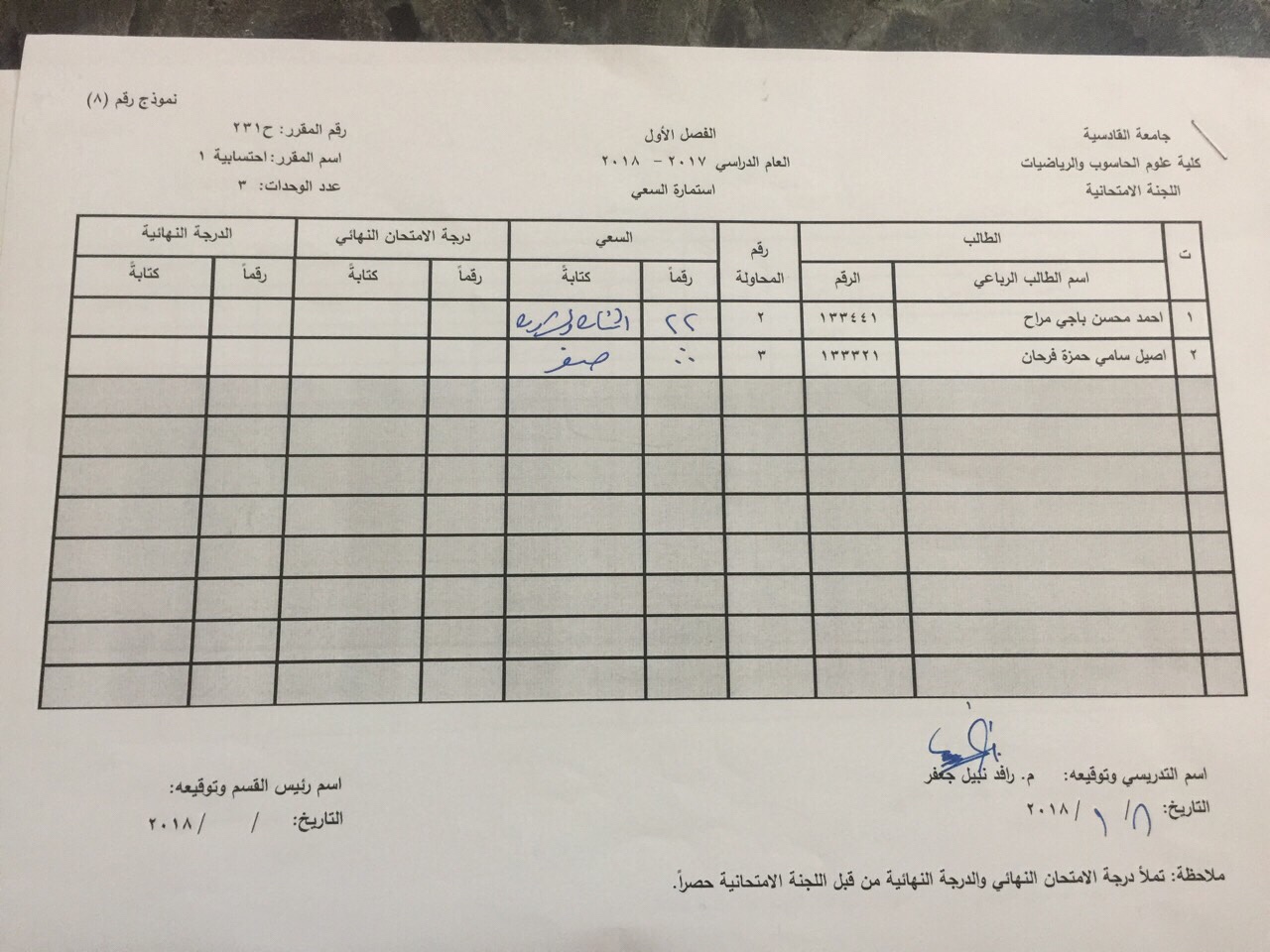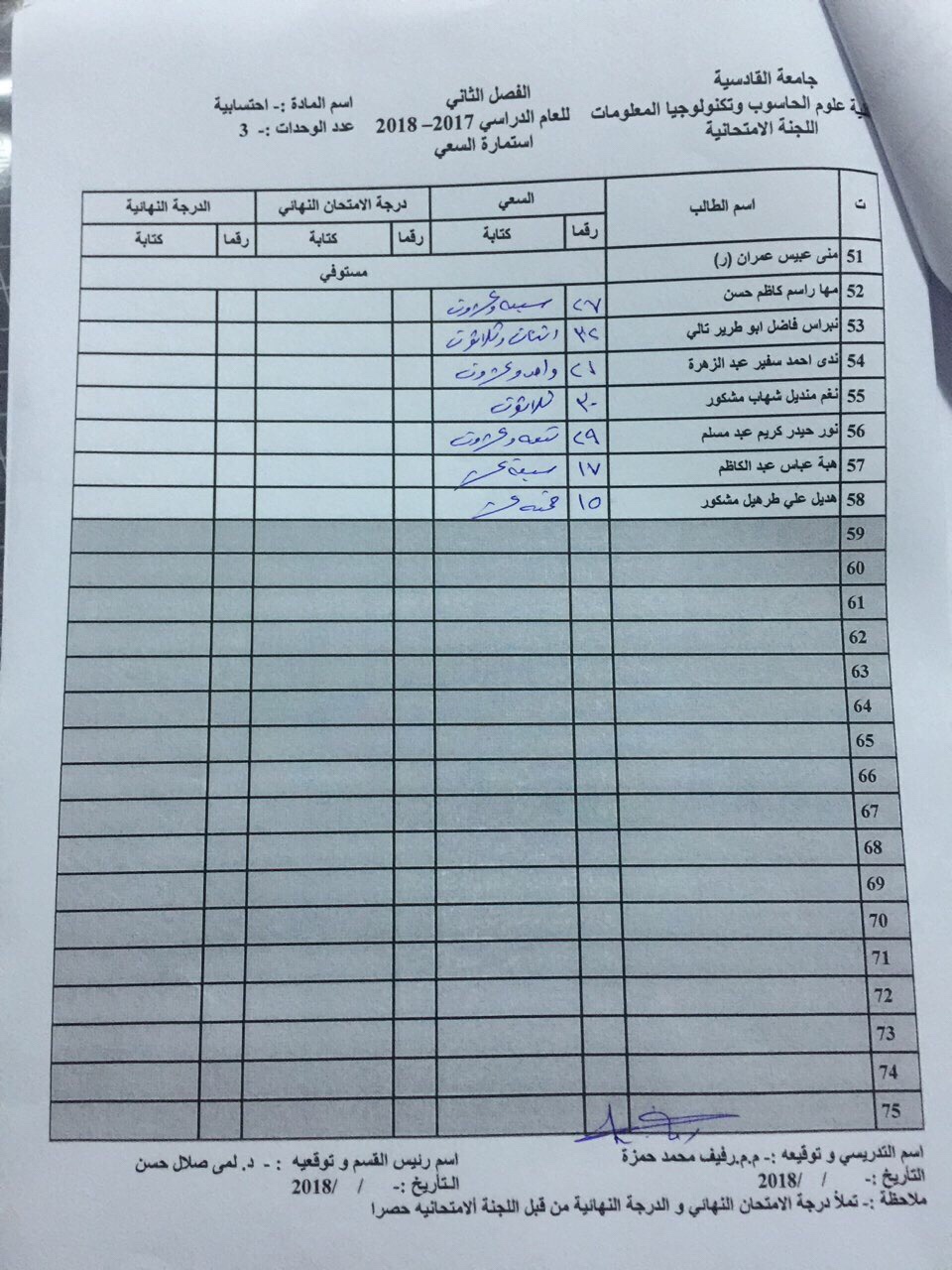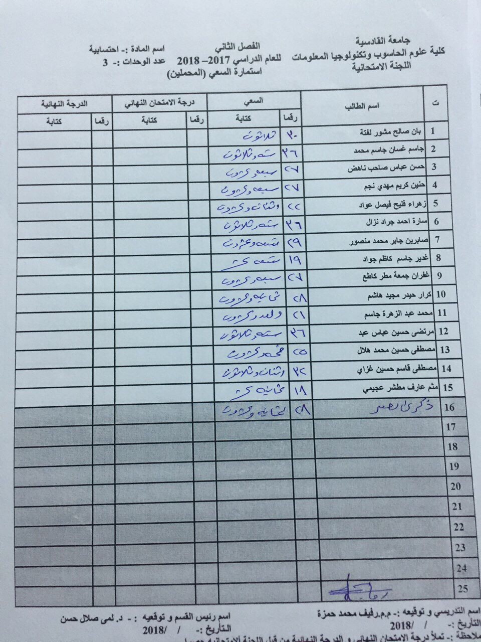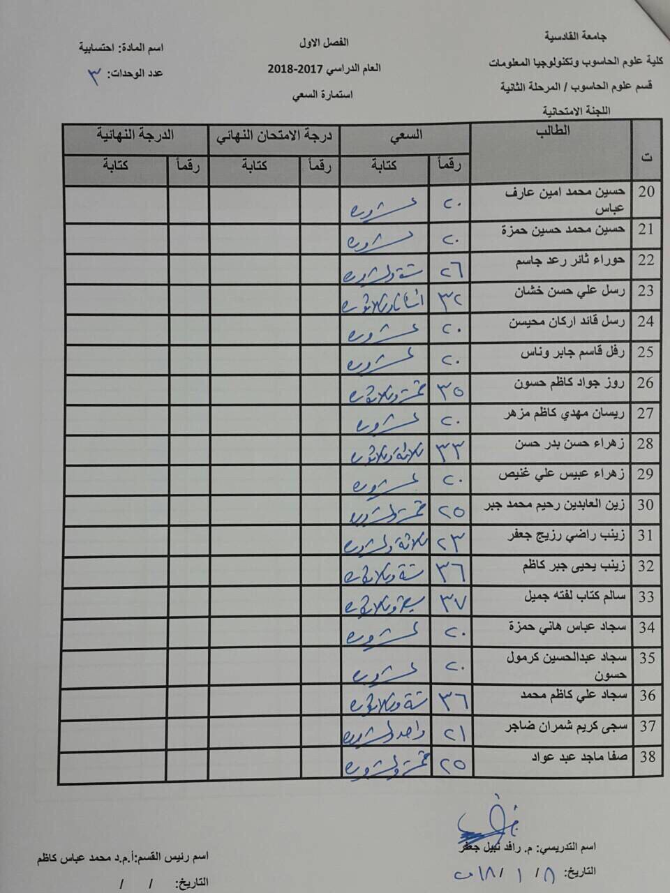 درجات السعي السنوي لمادة احسابية لجميع الاقسام