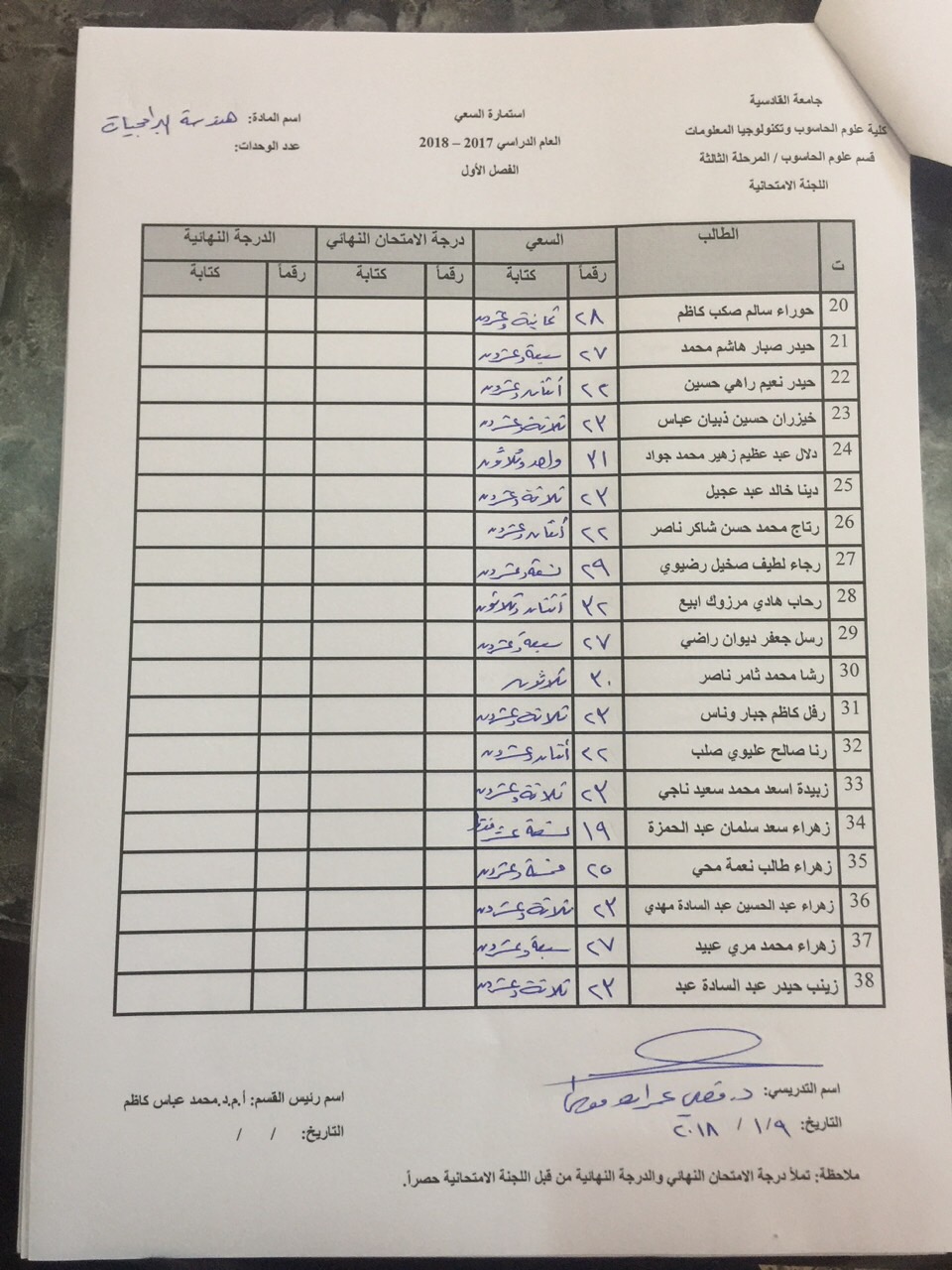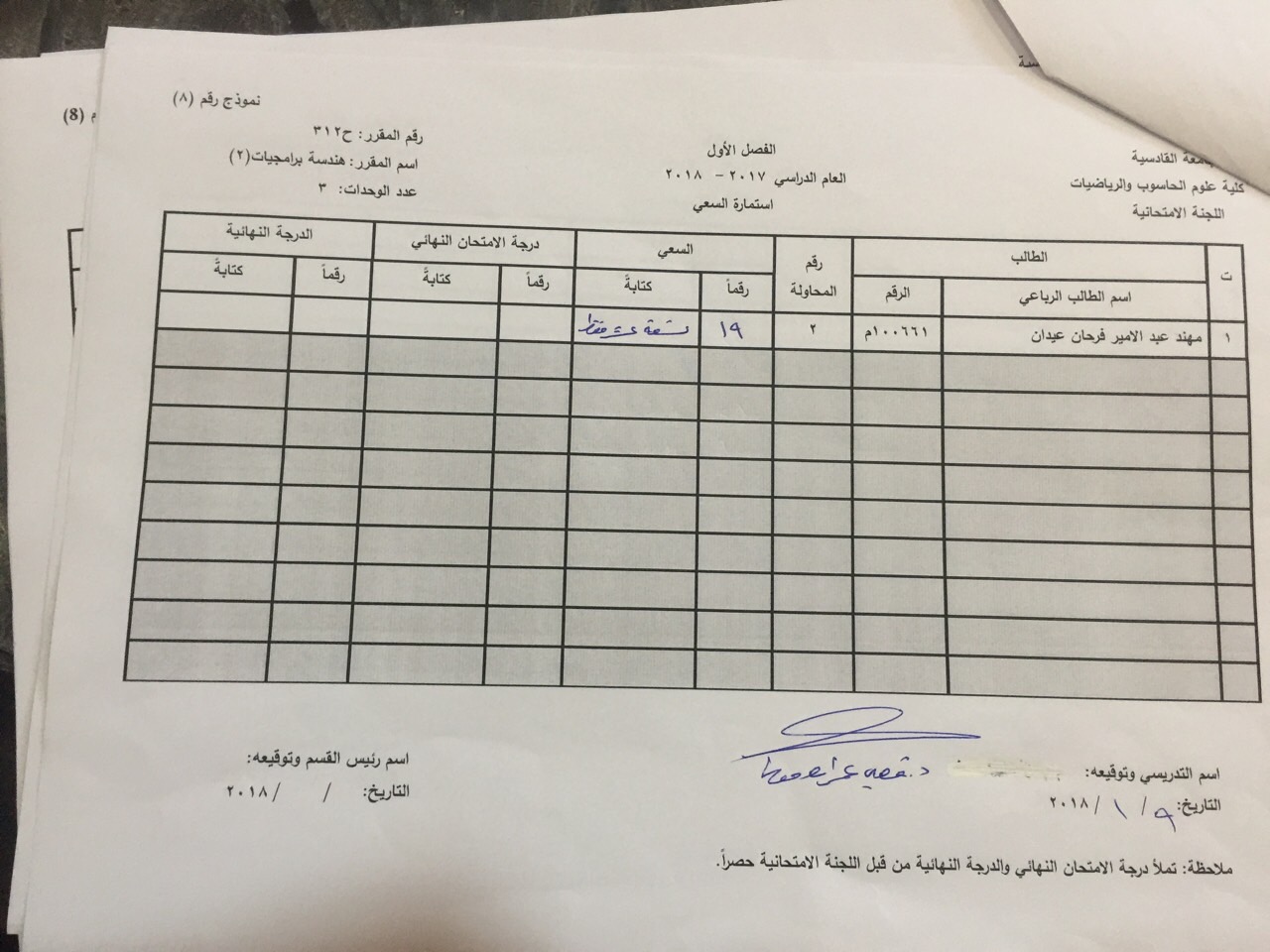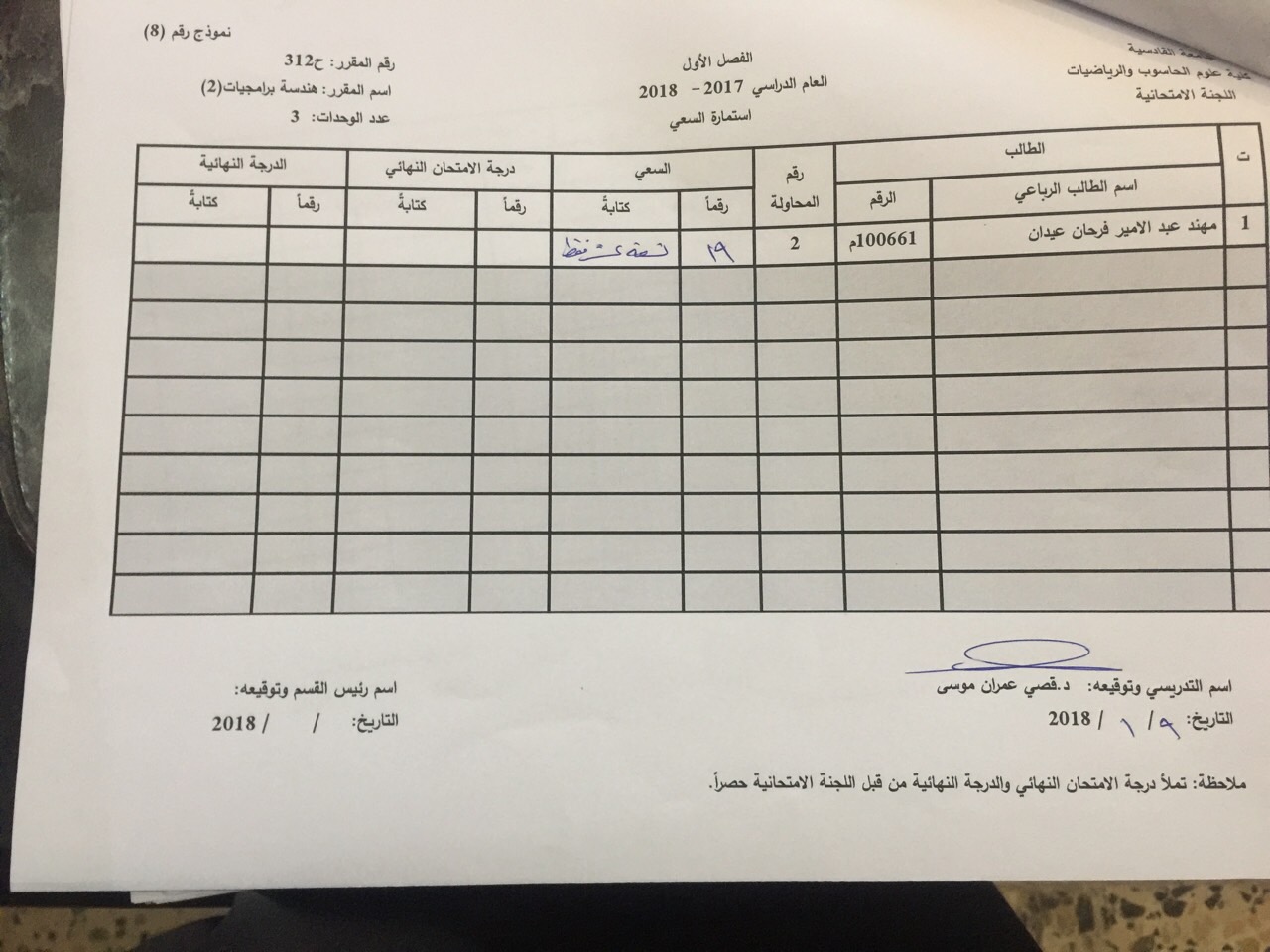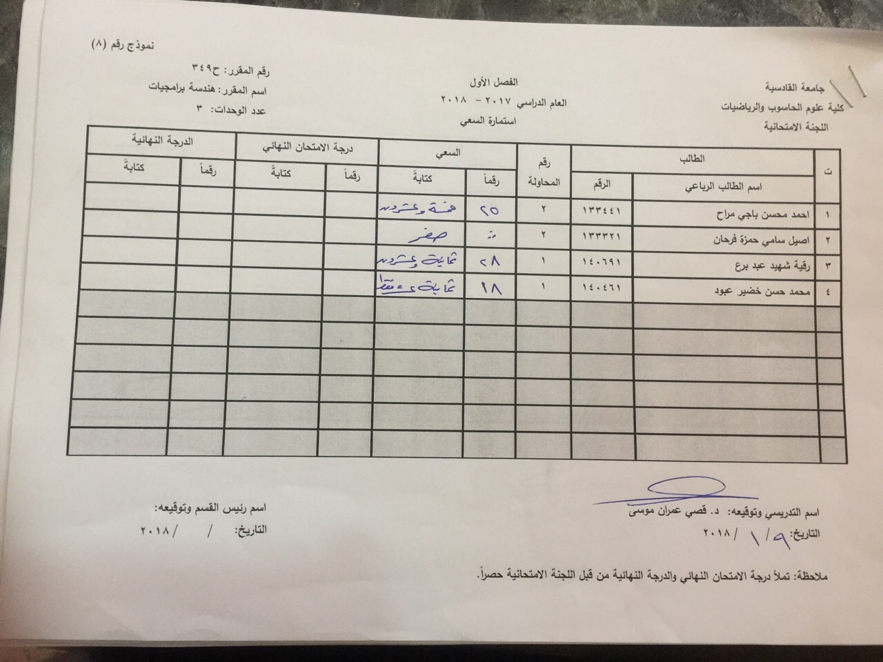 درجات السعي السنوي لمادة هندسة برامجيات
