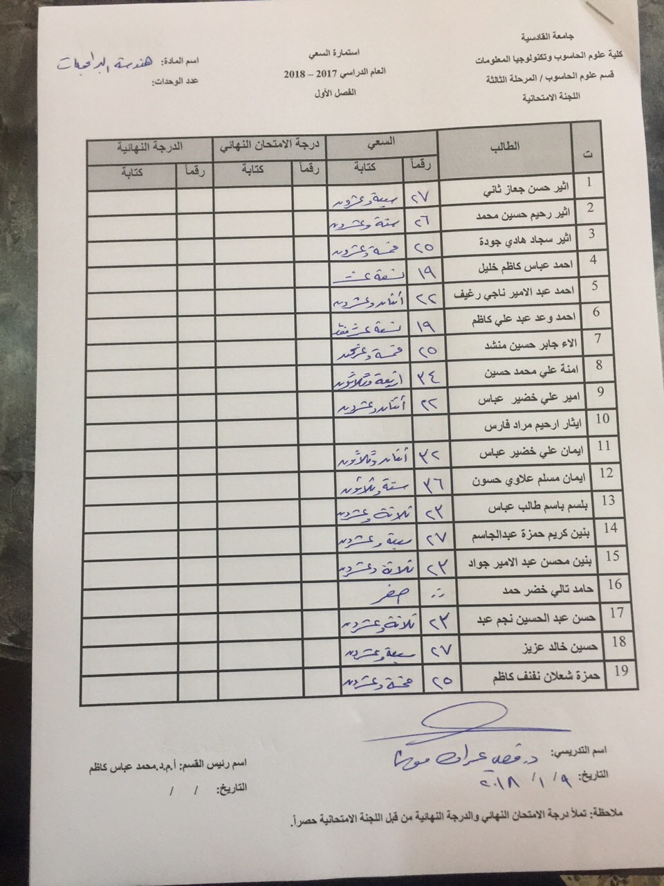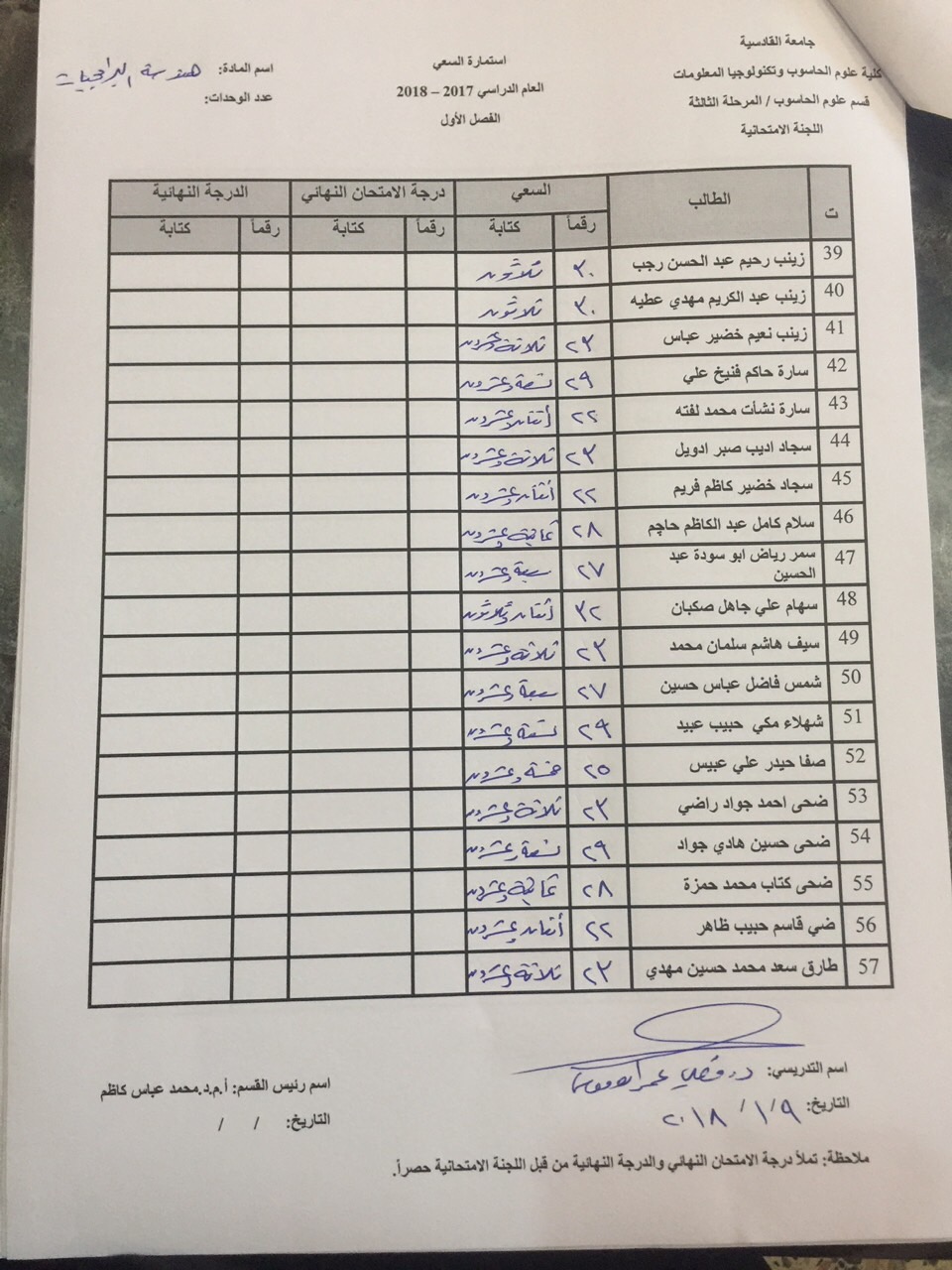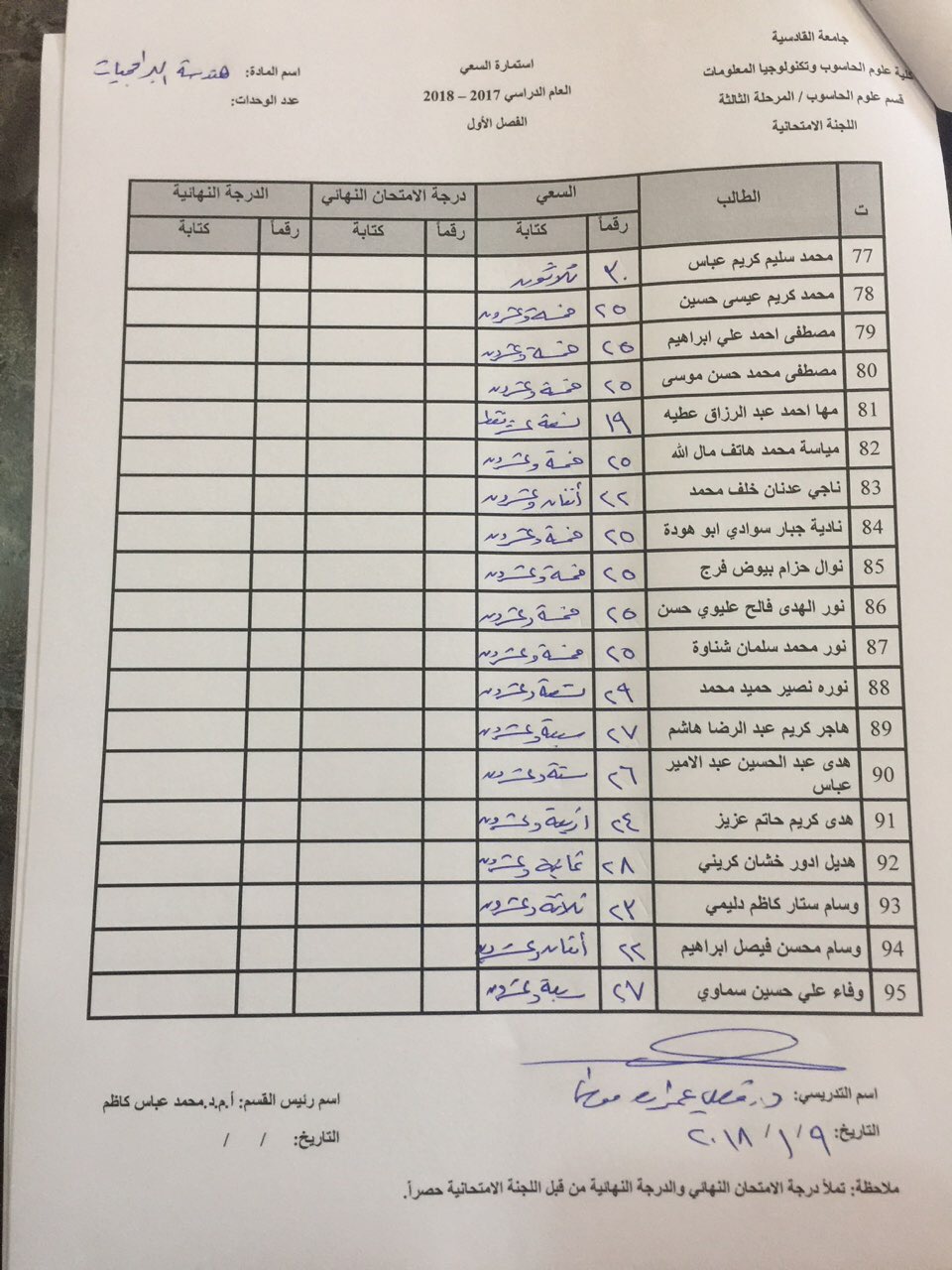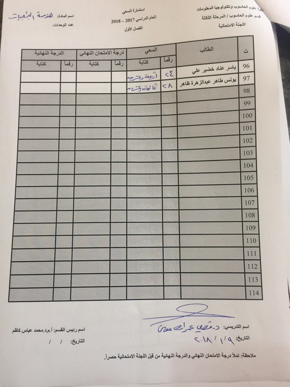 درجات السعي السنوي لمادة هندسة برامجيات