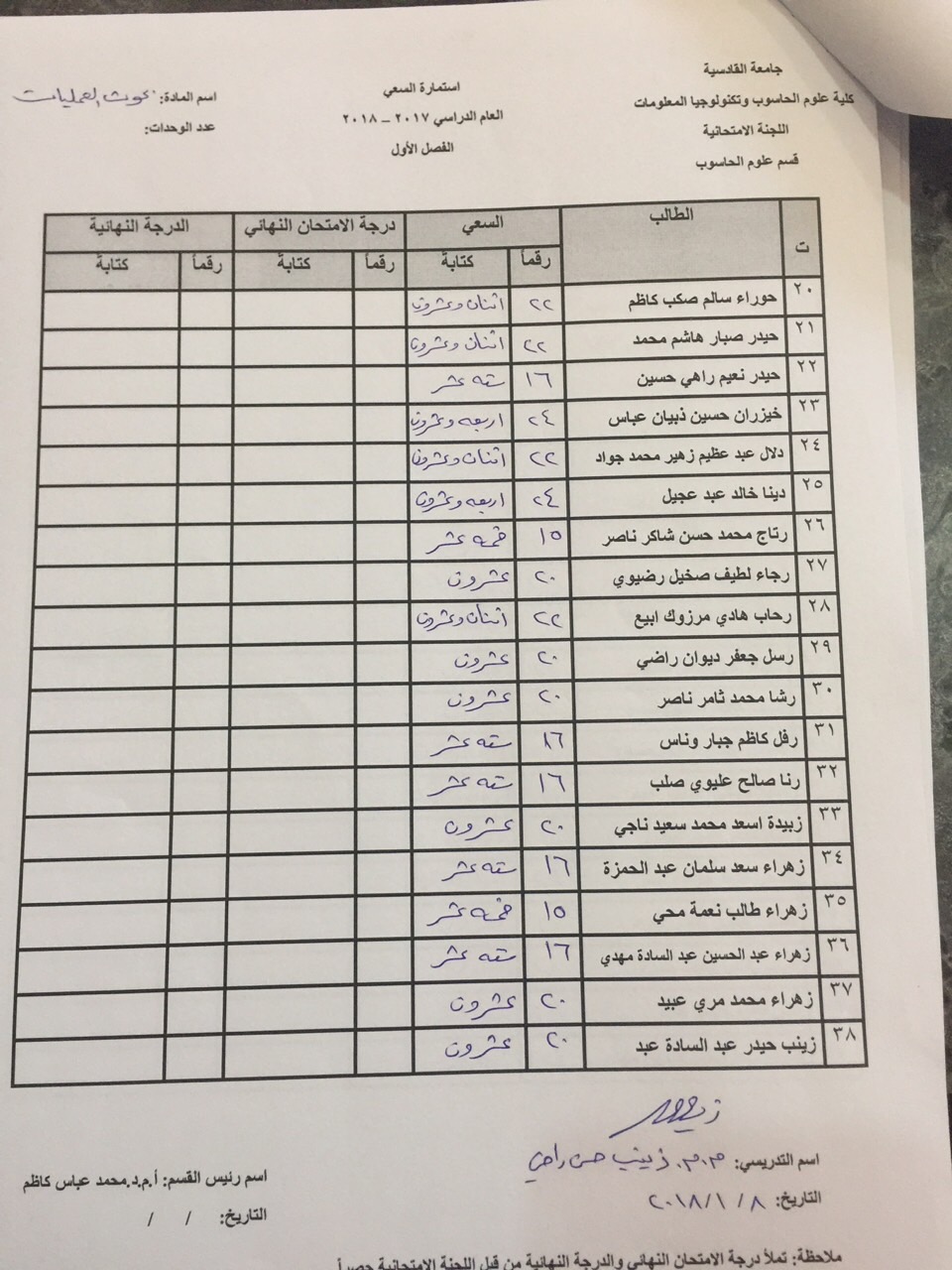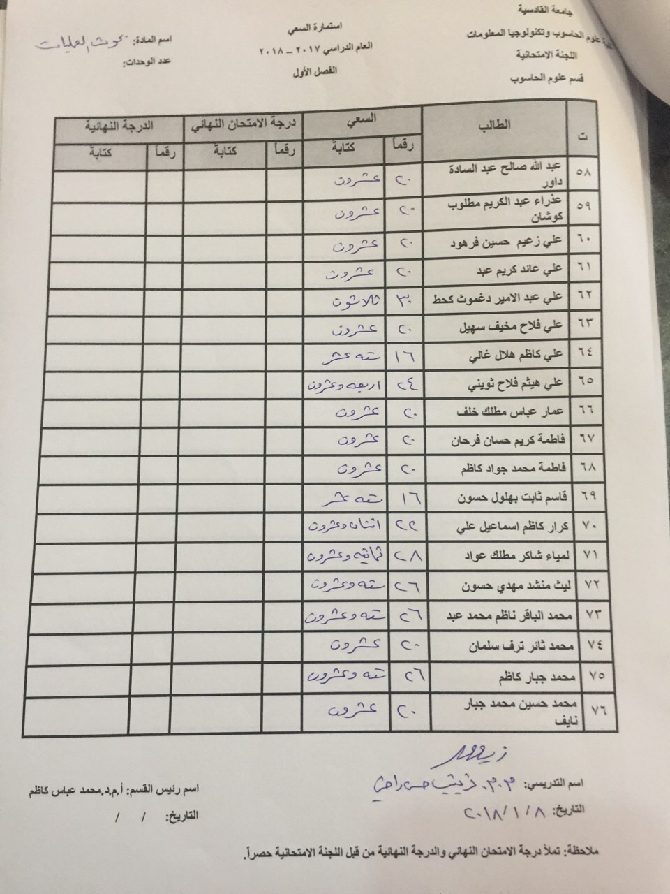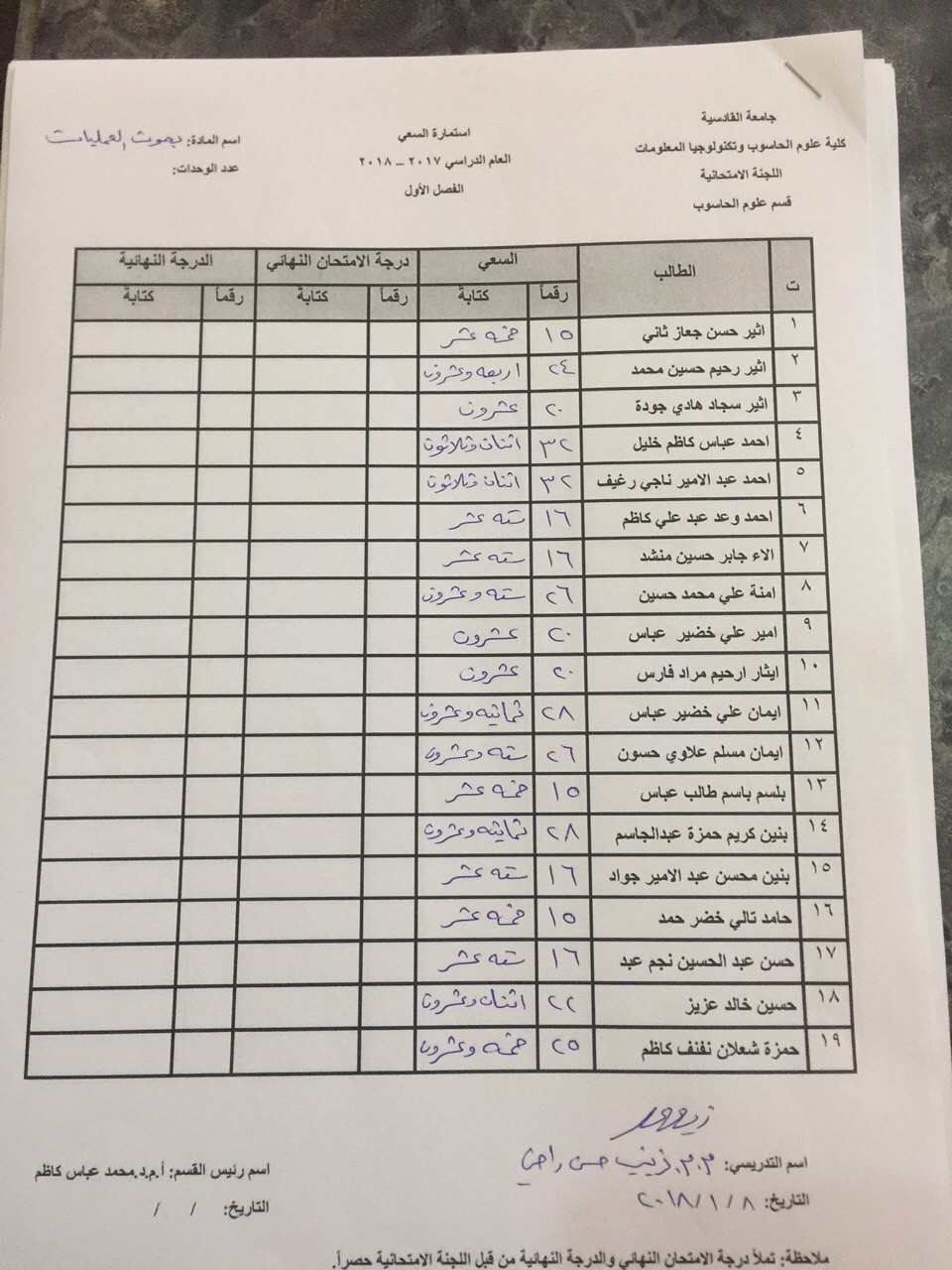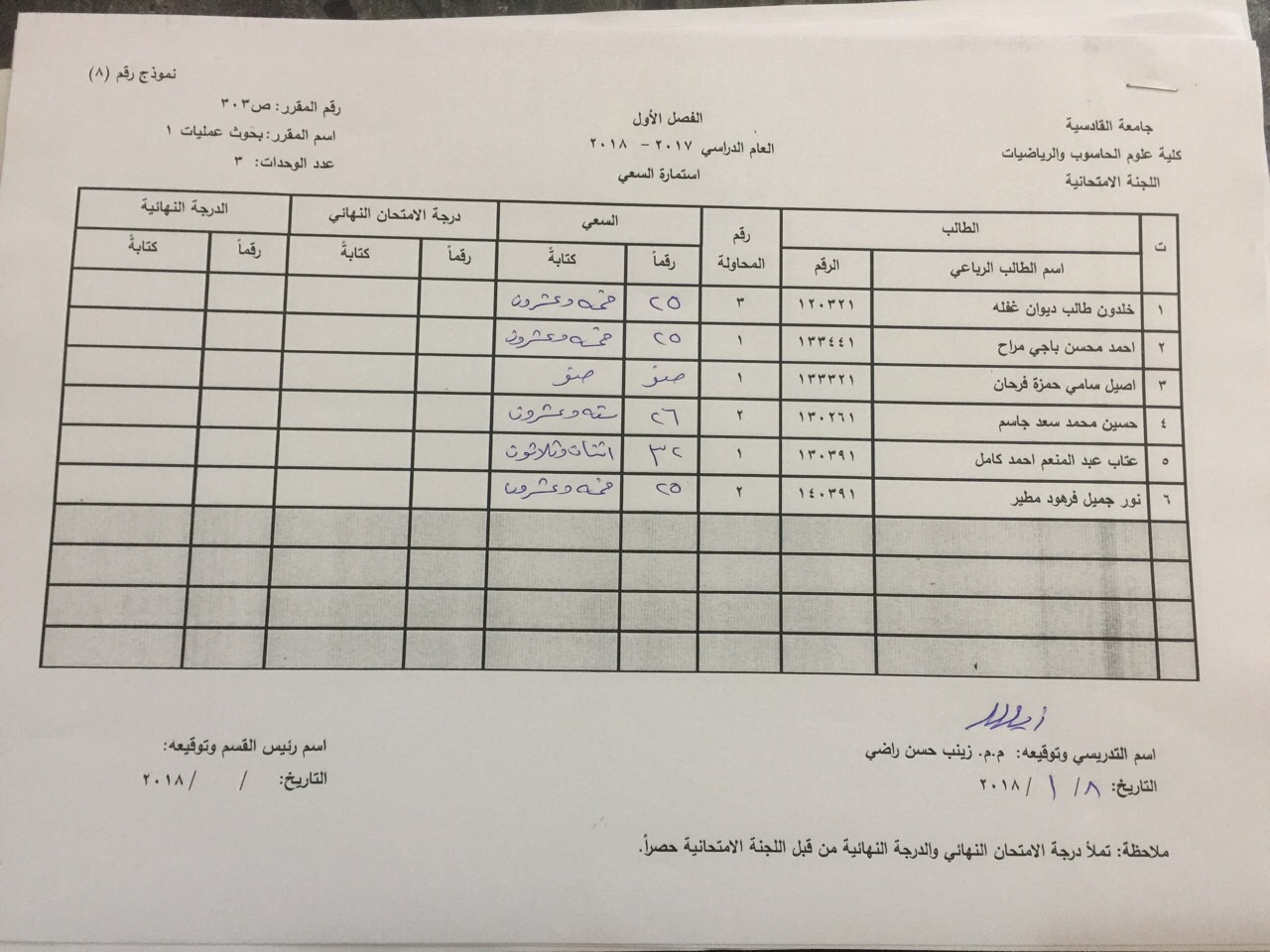 درجات السعي السنوي لمادة بحوث العمليات