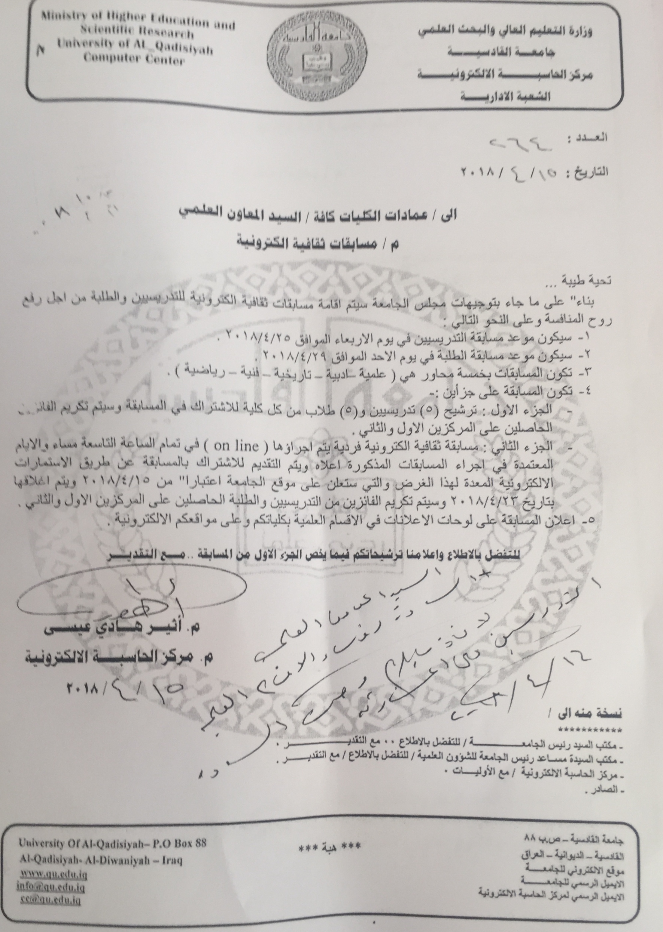 سيقيم مركز الحاسوب وخدمات الانترنت مسابقات الكترونية ثقافية خاصة بالتدريسيين والطلبة تتضمن مجموعة من الاسئلة في مجالات مختلفة علما” ان مسابقة الطلبة ستكون في يوم الاحد الموافق 29/4/2018 في مختبرات مركز الحاسوب اما المسابقة الخاصة بالسادة التدريسيين ستكون يوم الاربعاء الموافق 25/4/2018 في مختبرات مركزالحاسوب كذلك فعلى الراغبين بالاشتراك التسجيل من خلال الاستمارات الالكترونية المعدة لهذا الغرض وسيكرم الفائزون بالمسابقة بالمركزين الاول والثاني .