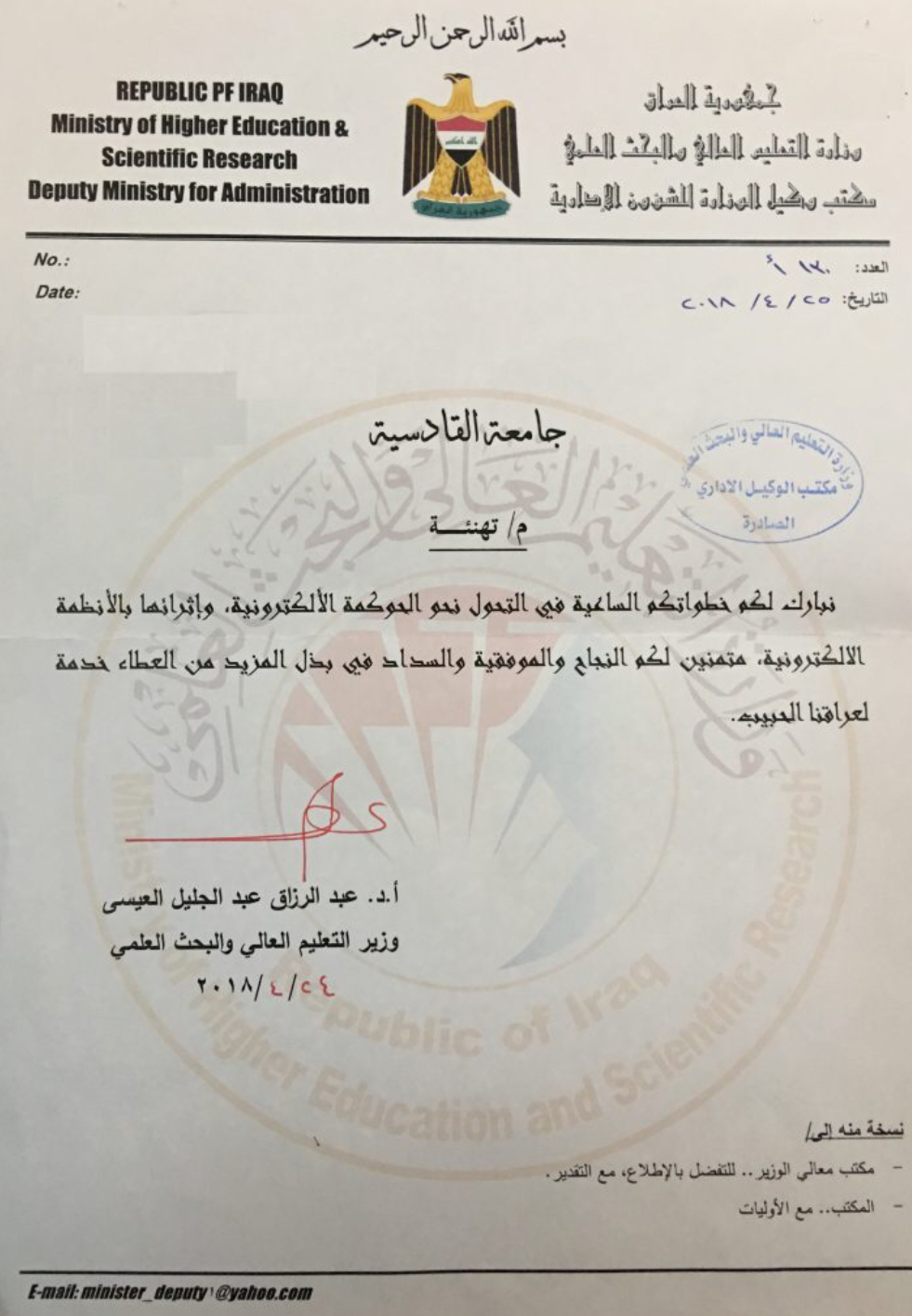 معالي وزير التعليم العالي و البحث العلمي الاستاذ الدكتور عبد الرزاق العيسى يهنىء جامعة القادسية في خطواتها الساعية للتحول نحو الحوكمة الالكترونية باستخدامها للانظمة الالكترونية في اعمالها وباستخدام بوابة الكترونية على موقع الجامعة .