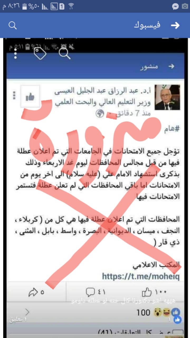 نوداعلامكم بان الصفحة اعلاه مزورة وامتحانات الفصل الثاني ٢٠١٧-٢٠١٨ الدور الاول مستمرة عند الإعلان عن أية عطله… لذا اقتضى التنوية.