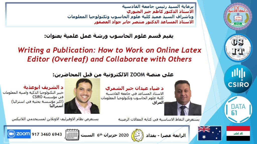 برعاية السيد رئيس جامعة القادسية الأستاذ الدكتور كاظم جبر الجبوري المحترم وبإشراف السيد عميد كلية علوم الحاسوب وتكنولوجيا المعلومات المحترم يقيم قسم الحاسوب محاضرة نوعية بعنوان ( Writing a Publication: How to Work on Online Latex Editor (Overleaf) and Collaborate with Others ) يلقيها كل من الأستاذ المساعد الدكتور ضياء عيدان الشمري المحترم والدكتور الشريف ابو عذبة المحترم من خلال منصة zoom علما ان meeting Id هو (91734606943) يوم السبت الموافق 2020/6/6 الساعة الرابعة مساءا