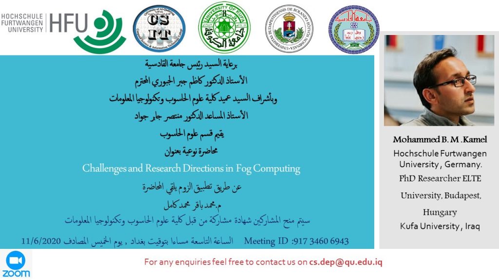 برعاية السيد رئيس جامعة القادسية الأستاذ الدكتور كاظم جبر الجبوري المحترم وبإشراف السيد عميد كلية علوم الحاسوب وتكنولوجيا المعلومات الأستاذ المساعد الدكتور منتصر جابر جواد المحترم يقيم قسم علوم الحاسوب، محاضرة نوعية بعنوان (التحديات واتجاهات البحث في حوسبة الضباب) يلقيها التدريسي م. محمد باقر محمد كامل التدريسي في جامعة الكوفة /كلية علوم الحاسوب .