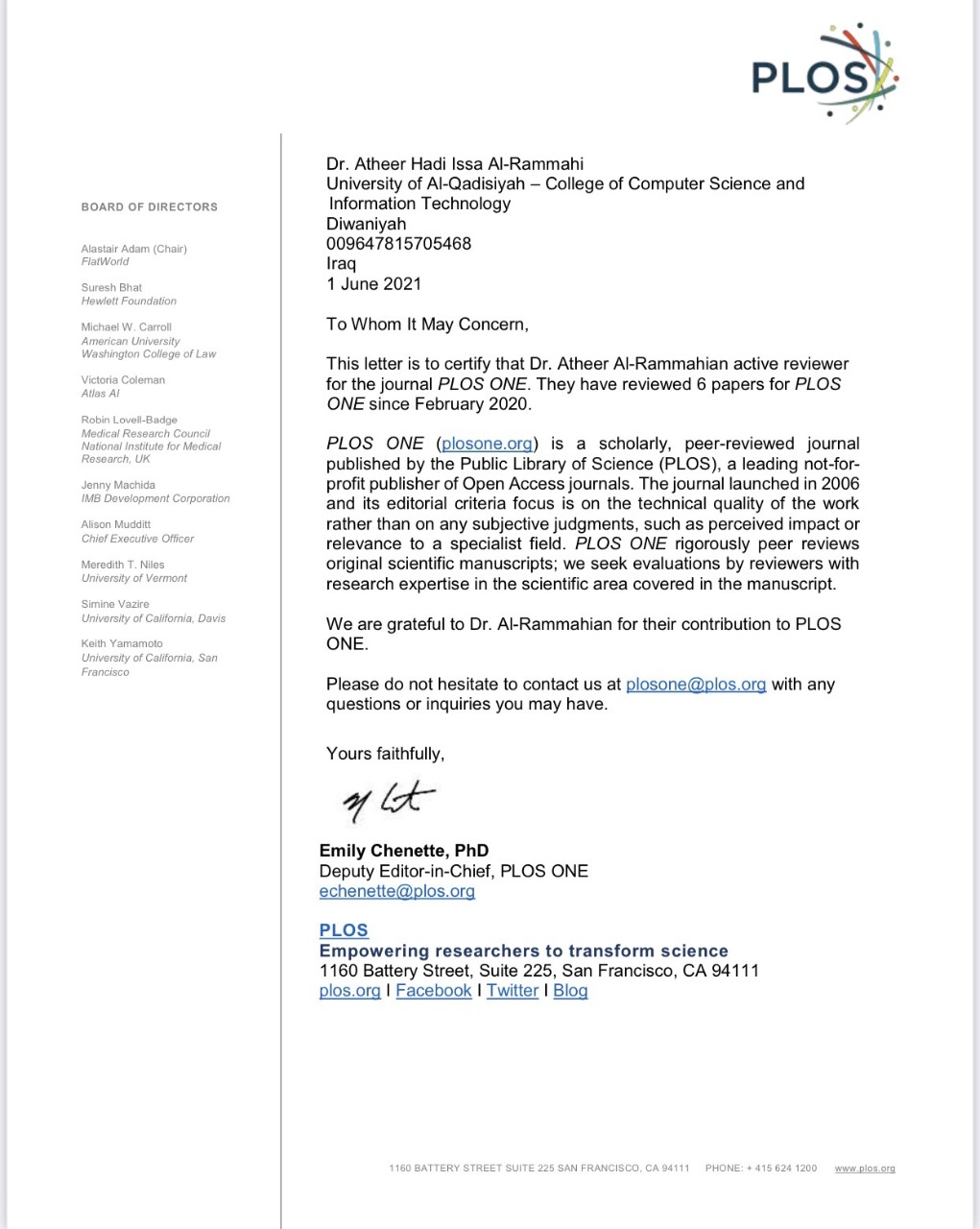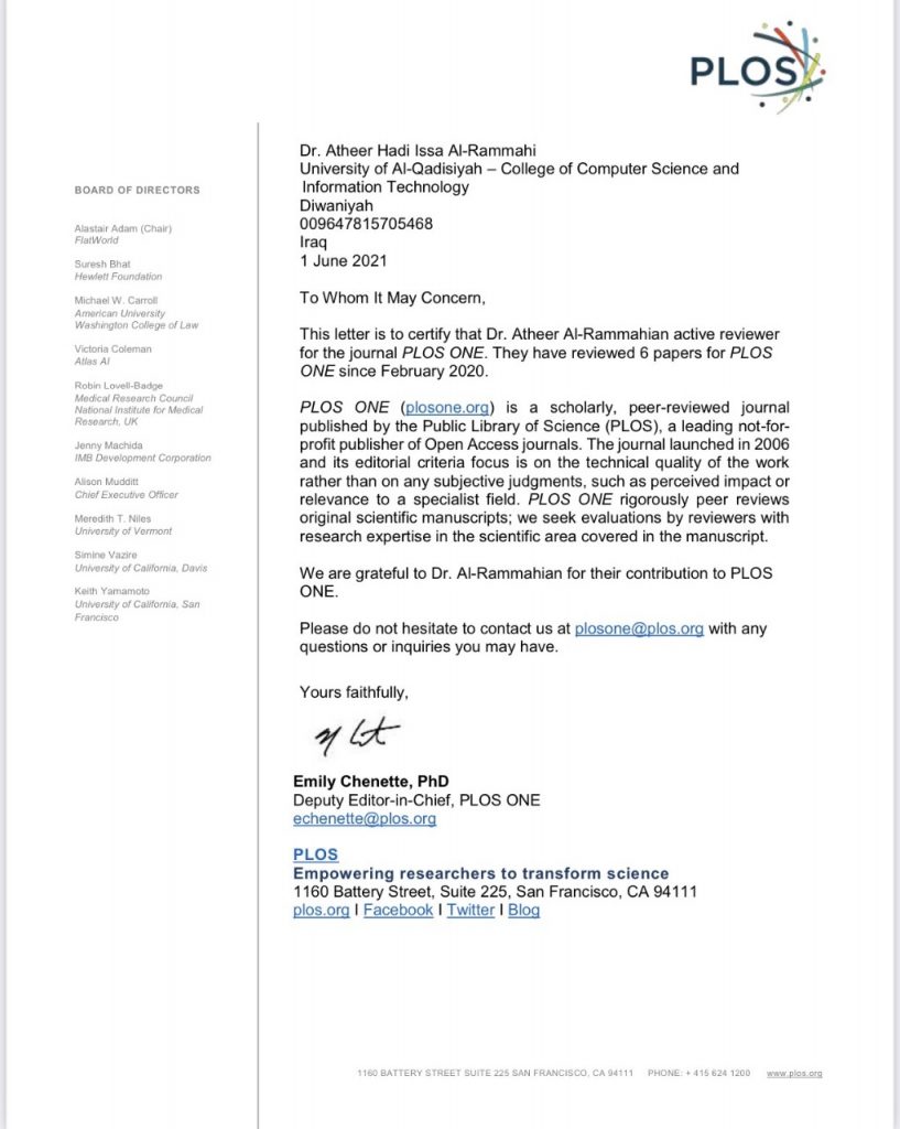 كنوع من انواع التقدم العلمي ومن ضمن الإسهامات العلمية المتميزة لكادر كلية علوم الحاسوب و تكنولوجيا المعلومات؛ تم إختيار أ. م أثير هادي عيسى (التدريسي في قسم نظم المعلومات الحاسوبية) كمقومٍ علمي في مجلةONE PLOS و هي من المجلات العالمية الرصينة التي تقع ضمن مستوعب سكوباص ضمن الفئة الأولى، و مستوعب m.clarivate . هذا وتجدر الإشارة الى التصاعد العلمي المميز في عدد البحوث العلمية الرصينة المنشورة من قبل كوادر الكلية التدريسية وإختيارهم كمقوّمين علميين في كثيرٍ من المجلات العالمية… فهو مدعاة للفخر ومعه نتطلع للمزيد من التميز العلمي… ومن الله التوفيق..