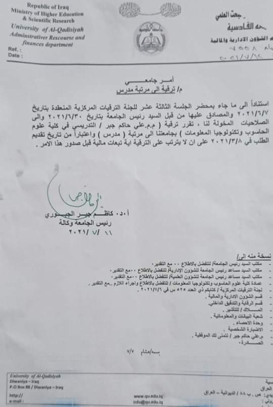 أجمل التهاني والتبريكات تقدمها عمادة كلية علوم الحاسوب وتكنولوجيا المعلومات إلى قسم الوسائط المتعددة والتدريسي فيه السيد علي حاكم جبر بمناسبة ترقيته من مرتبة مدرس مساعد الى مرتبة مدرس… راجين له دوام النجاح والتوفيق في مسيرته العلمية..