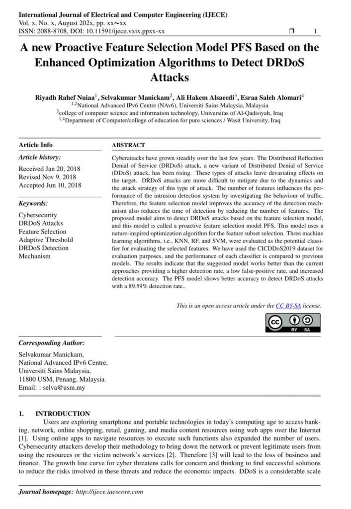 شاركت كلية علوم الحاسوب وتكنولوجيا المعلومات/جامعة القادسية متمثلةً بالباحث المجدّ المدرس علي حاكم جبر٠٠ (التدريسي في قسم الوسائط المتعددة)؛ في فريقٍ بحثي نتجَ عن التعاونِ معه نشرٌ عالمي لتقنيةٍ جديدةٍ بإستخدام الذكاء الإصطناعي تحدد إستباقياً الهجومات الأمنية مع إشعارٍ مبكرٍ لإتخاذ الإحترازات الأمنية الإلكترونية، و تم نشر البحث في مجلة International Journal of Electrical and Computer Engineering وهي مجله عالمية رصينة مضمنة في مستوعب سكوباس Q2 ومصنفة ضمن مستوعب كلاريفت..