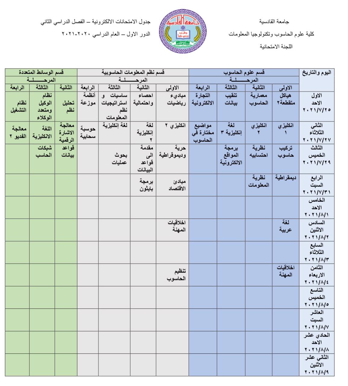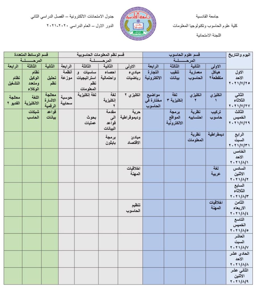تعلن كلية علوم الحاسوب وتكنولوجيا المعلومات عن جداول الإمتحانات الإلكترونية النهائية للفصل الدراسي الثاني للعام الدراسي ٢٠٢٠-٢٠٢١ راجين من كافة الطلبة التعاون والإلتزام بتوجيهات اللجنة الإمتحانية المركزية لإنجاح العملية الامتحانية واختتام العام الدراسي…
