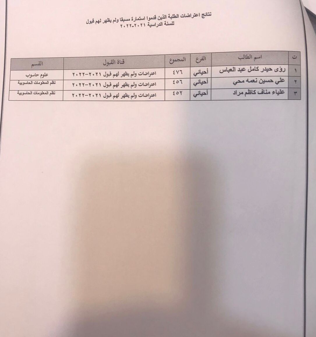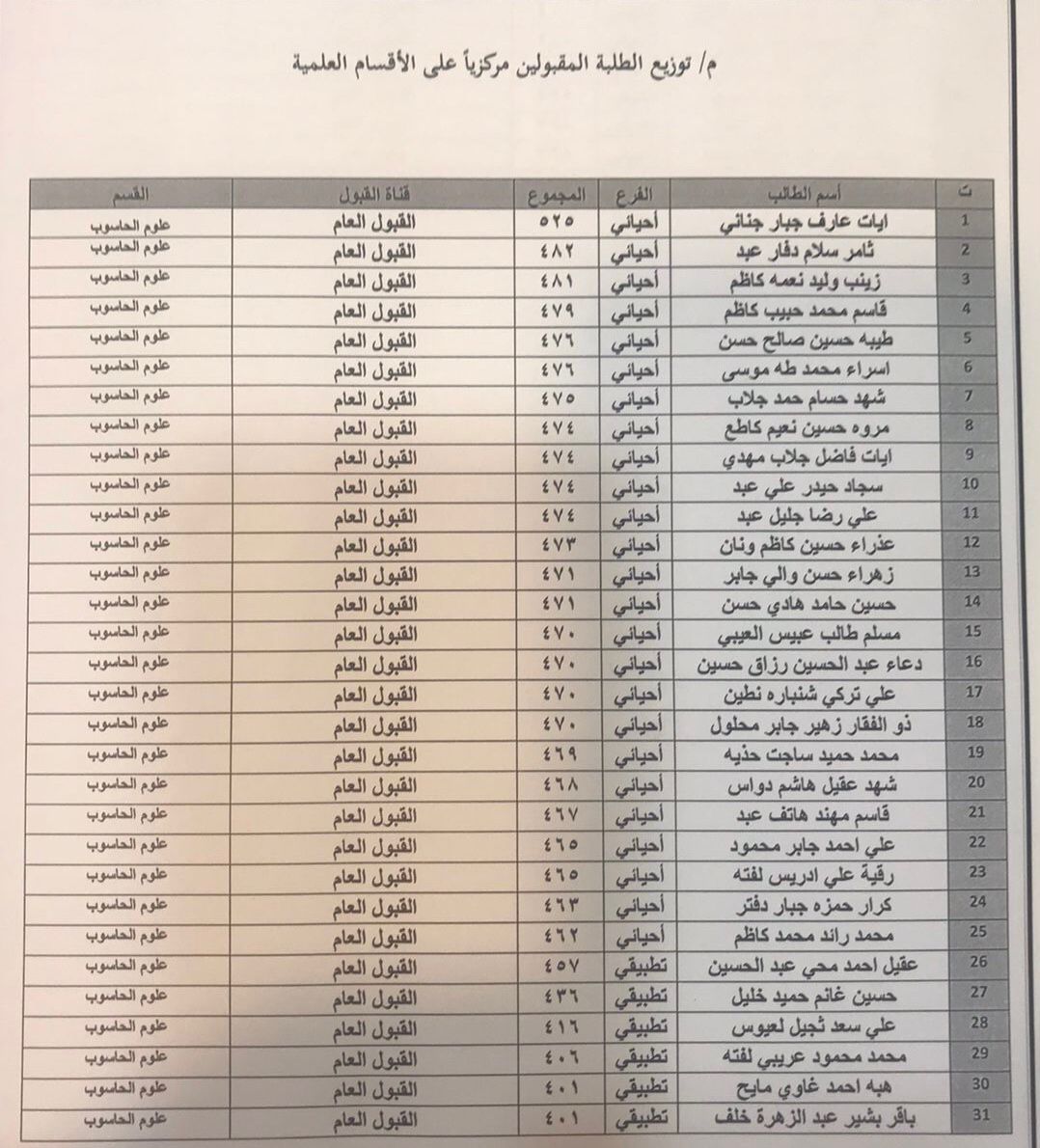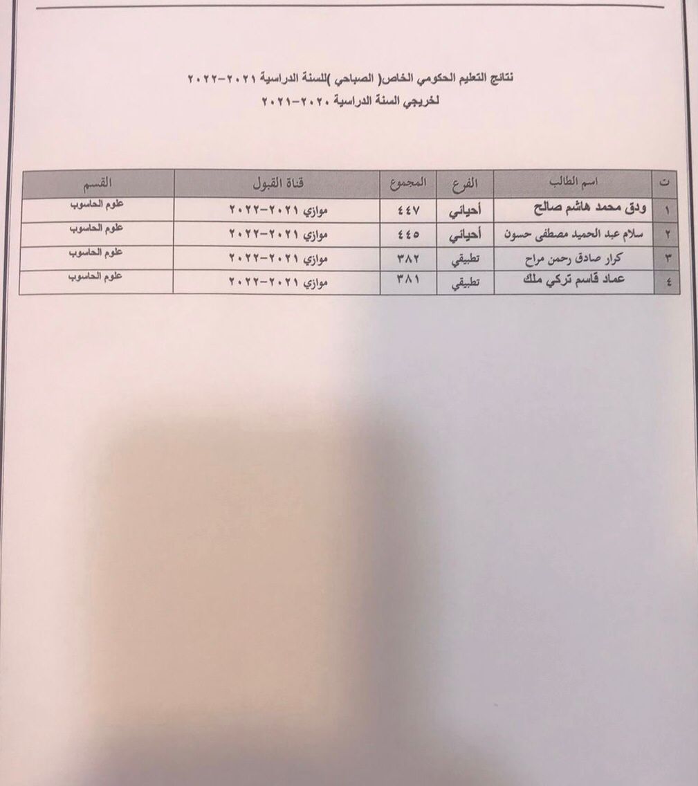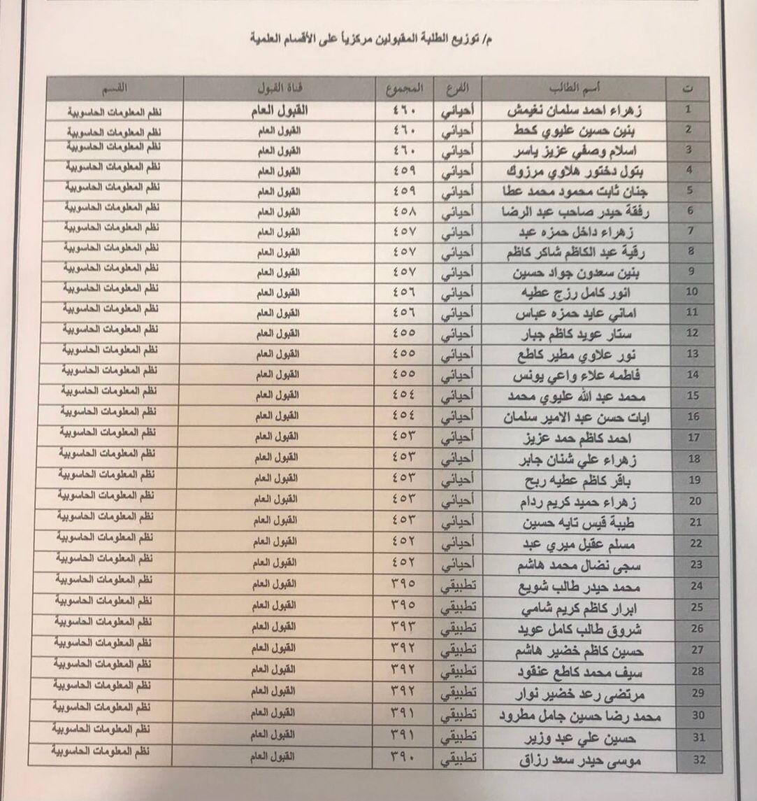 أكملت كلية علوم الحاسوب وتكنولوجيا المعلومات إجراءات تسجيل الطلبة المقبولين في الدراسة الأولية الصباحية للعام الدراسي ٢٠٢١-٢٠٢٢ كما أكملت اللجان الإدارية توزيع الطلبة على الأقسام العلمية باعتماد معياري الرغبة والمعدل، وعلى الطلبة كافة الإلتحاق بالدوام ومراجعة أقسامهم العلمية.