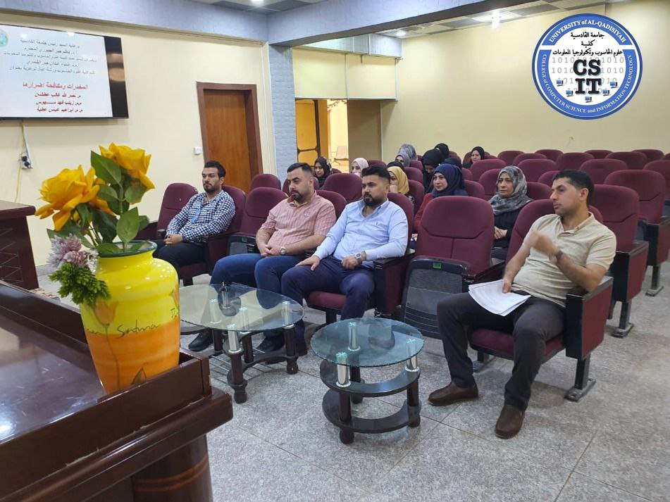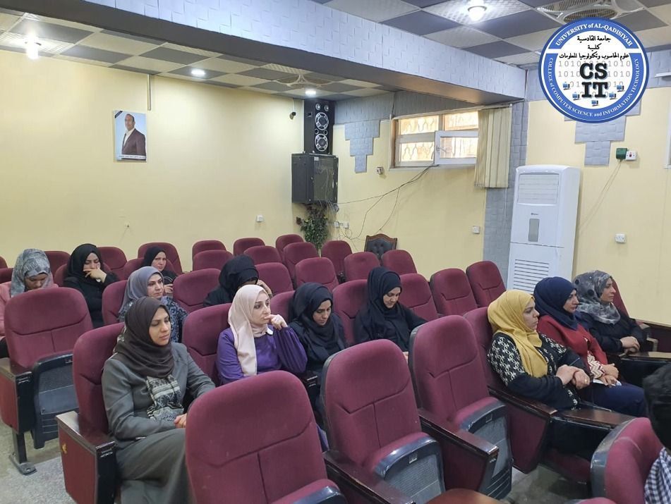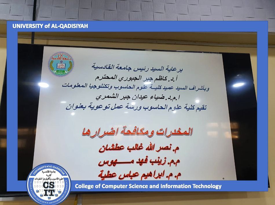 برعاية السيد رئيس جامعة القادسيه أ.د. كاظم جبر الجبوري المحترم، وبإشراف السيد عميد كلية علوم الحاسوب وتكنولوجيا المعلومات أ.م.د. ضياء عيدان جبر الشمري المحترم أقامت وحدة التعليم المستمر في الكلية ورشة علمية عنوانها ( تاثير المخدرات صحياً واجتماعيا) ألقاها الأساتذة كل من: م. نصرالله غالب عطشان، و م.م زينب فهد مهوس، وم.م إبراهيم عباس عطية في قاعة الدكتور ( محمد عباس الجبوري) بتاريخ 11 / 4 /2022 حيث ناقشوا فيها تأثير المخدرات على الجانب الصحي، ومدى سلبيتها على الأسرة والمجتمع، لقد أثارت المحاور التي طرحها المحاضرون خلال الورشة تفاعلا عاليا من قبل الحاضرين لما لموضوعها من الأهمية في رفع الوعي والإدراك، ولما طرحته من حلول ومقترحات لتحصين أفراد المجتمع من هذه الظاهرة الخطيرة.