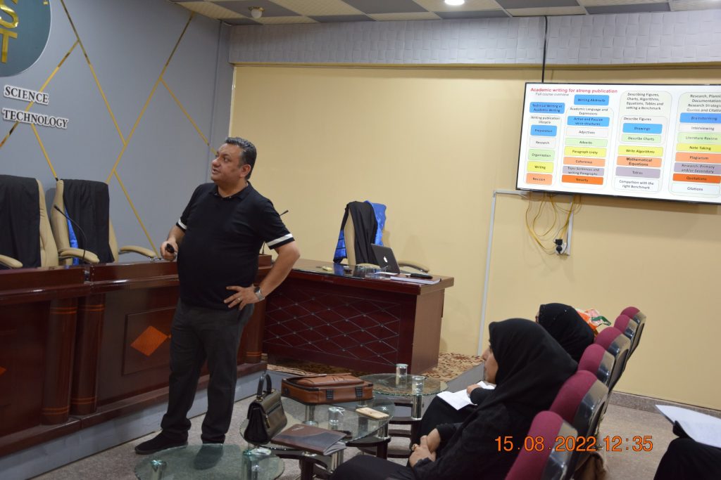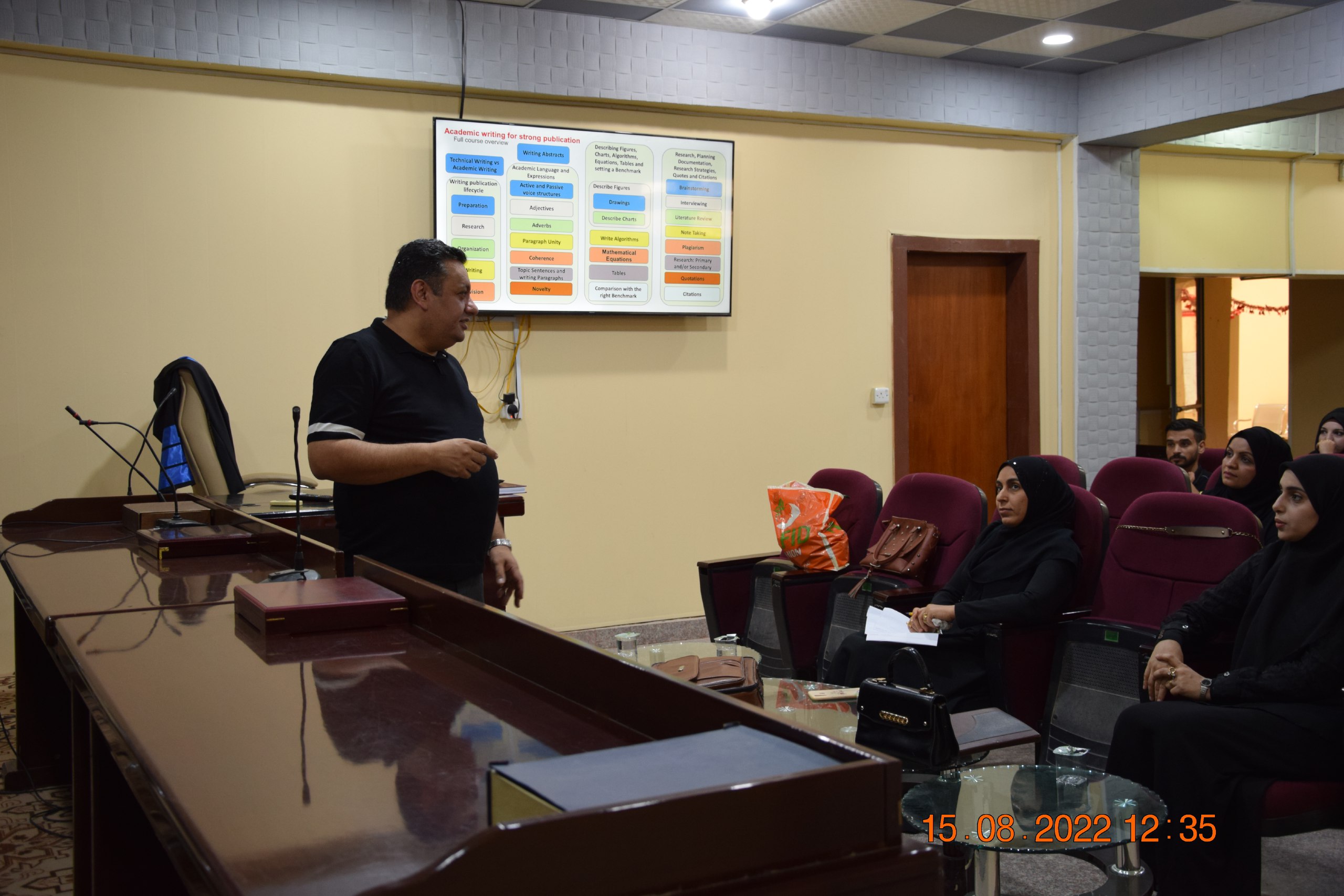 إنطلقت يوم أمس الأحد المصادف 14/8/2022 دورة تدريبية نوعية حول أساليب الكتابة الأكاديمية للبحوث العلمية ورسائل الماجستير وأطاريح الدكتوراه لطلبة الدراسات العليا والباحثين في المجالات العلمية، ألقاها السيد عميد كلية علوم الحاسوب وتكنولوجيا المعلومات الأستاذ المساعد الدكتور ضياء عيدان جبر الشمري حيث تطرق إلى ضرورة الإهتمام بإخراج وعرض البحوث العلمية على وفق المواصفات العلمية الأكاديمية للتمكن من نشرها في دور النشر العالمية الرصينة ضمن مستوعبات سكوبس وكلاريفيت.
