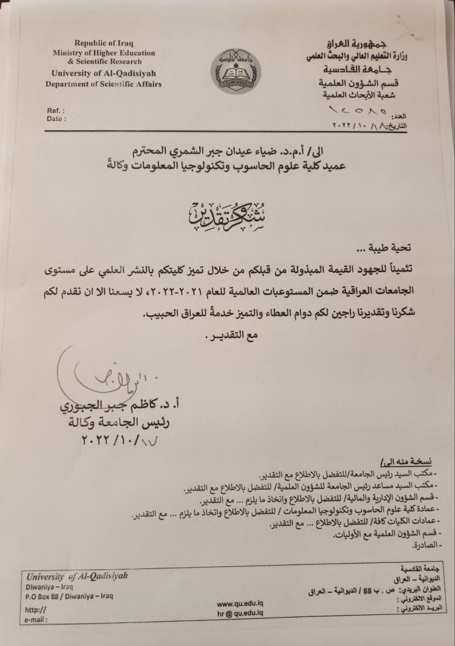 تم تكريم كلية علوم الحاسوب وتكنولوجيا المعلومات من قبل رئاسة جامعة القادسية الموقرة لإنشائها موقعا متقدما في نشر البحوث العلمية عالميا في دور النشر العالمية الرصينة ضمن مستوعبات سكوبوس وكلاريفت، حيث احتلت الكلية الموقع الثاني بين كليات جامعة القادسية بمايقترب من ثلاثمائة بحث، وبهذه المناسبة بارك السيد عميد الكلية الأستاذ المساعد الدكتور ضياء الشمري لكافة أعضاء الهيئة التدريسية وثمّن جهودهم الكبيرة وعطائهم المتميز في تحديد المشاكل التقنية والمجتمعية وطرح الحلول الكفوءة من خلال بحوثهم المتميزة، كما بيّن الشمري أن هذا الإنجاز أتى كثمرة للتخطيط المدروس من قبل الكلية في تخفيض أحمال التدريس وزيادة أحمال البحث العلمي، وماهذا الإنجاز إلّا البداية للتقدم البحثي الكبير بعد استكمال الخطة العلمية في استحداث برامج الدراسات العليا واستحداث وحدة أبحاث المعلوماتية المتطلعة إلى مستقبل علمي كبير في مجال البحث العلمي، إلى جانب الأنشطة العلمية المختصة في تطوير مهارات البحث العلمي من ندوات علمية وورش عمل ودورات تدريبية، لقد أضاف الشمري أن الانسجام الفعلي العالي لمنتسبي الكلية ساهم بشكل فاعل في خلق الشراكات العلمية البحثية بين أعضاء الهيئة التدريسية ضمن أجواء العائلة الواحدة.. ومن الله التوفيق والسداد… .