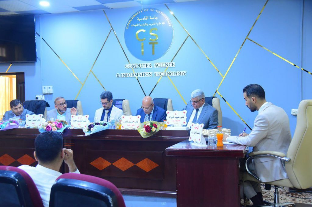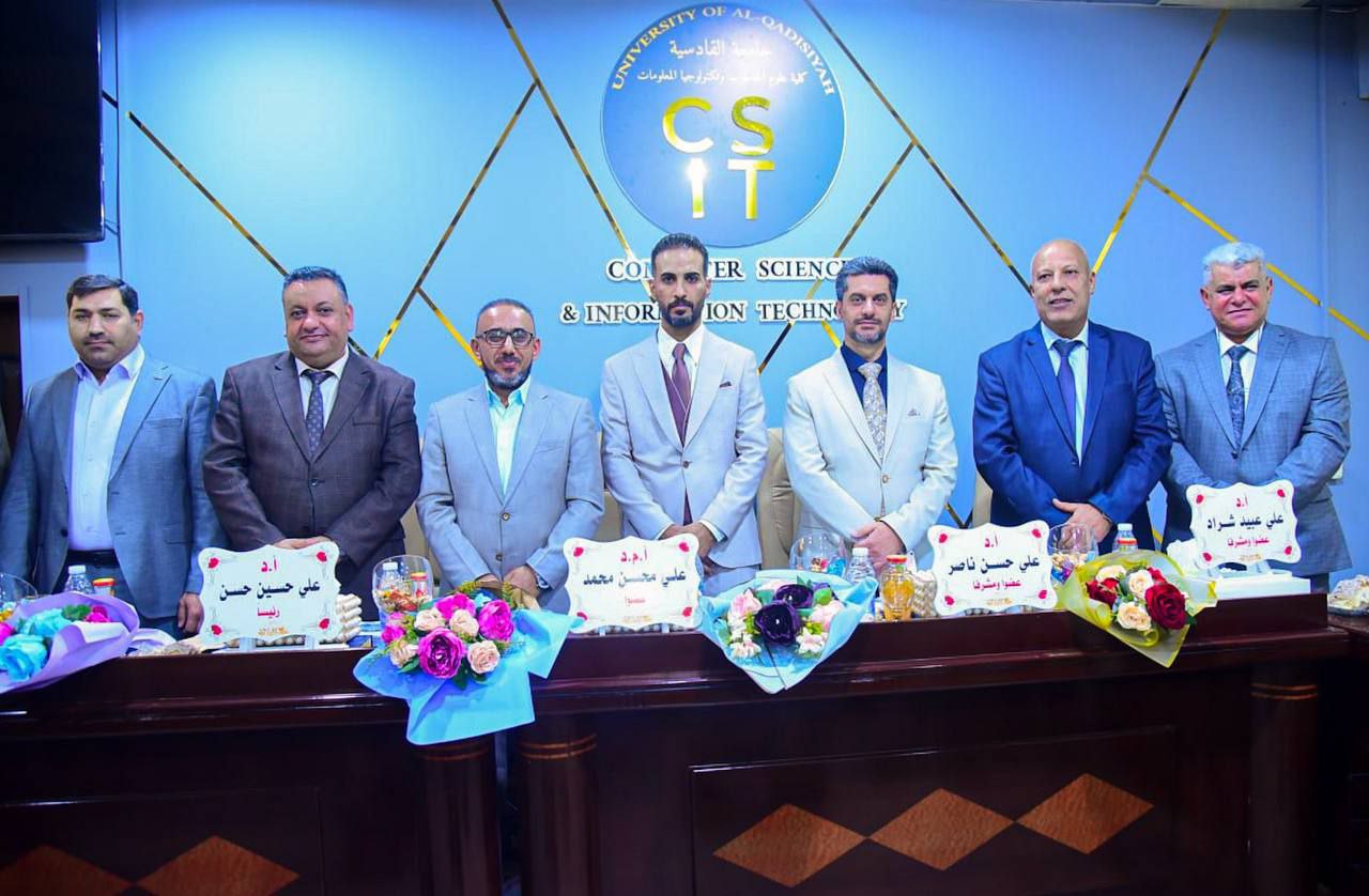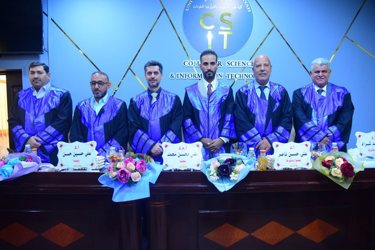 أجريت المناقشة على قاعة الدكتور محمد عباس الجبوري في كلية علوم الحاسوب وتكنولوجيا المعلومات وتألفت لجنة المناقشة من: