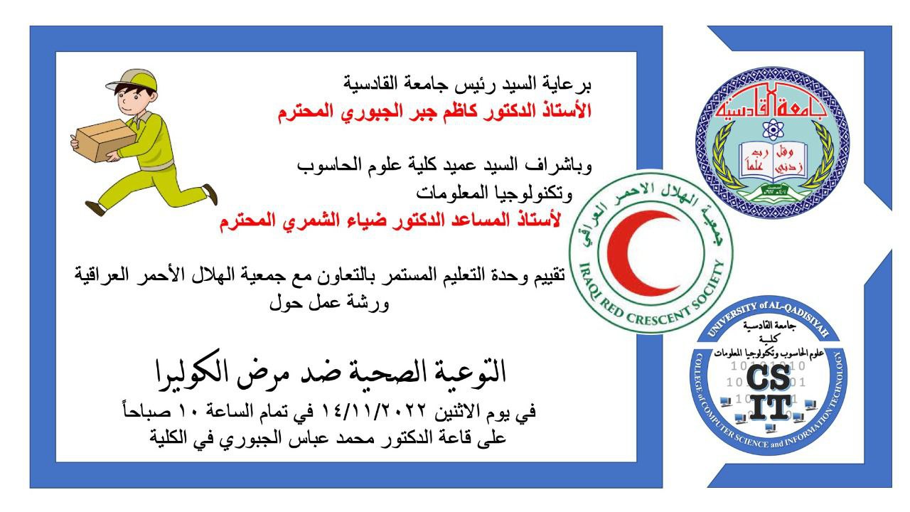برعاية السيد رئيس جامعة القادسية الأستاذ الدكتور كاظم جبر الجبوري المحترم وبإشراف السيد عميد كلية علوم الحاسوب وتكنولوجيا المعلومات الأستاذ المساعد الدكتور ضياء الشمري؛ أقامت وحدة التعليم المستمر في الكلية ورشة عمل توعوية صحية حول التعامل مع مرض الكوليرا؛ بالتعاون مع جمعية الهلال الأحمر العراقية/ فرع الديوانية.