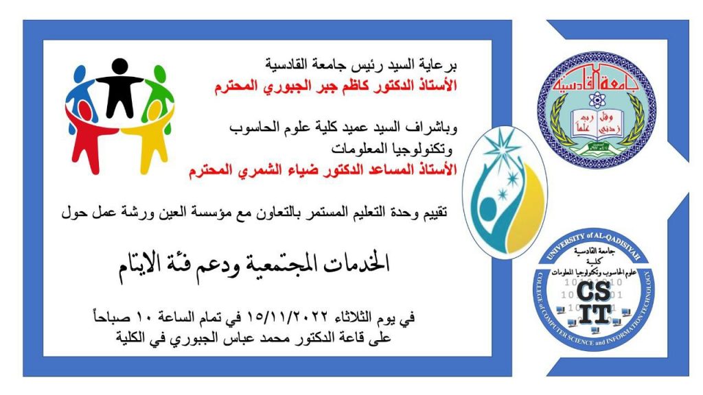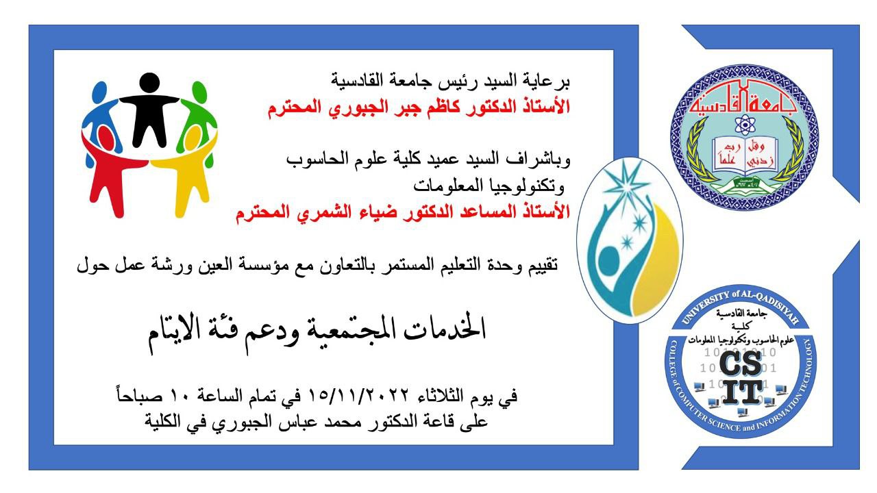 برعاية السيد رئيس جامعة القادسية الأستاذ الدكتور كاظم جبر الجبوري المحترم وبإشراف السيد عميد كلية علوم الحاسوب وتكنولوجيا المعلومات الأستاذ المساعد الدكتور ضياء الشمري؛ أقامت وحدة التعليم المستمر في الكلية ورشة عمل نوعية بالتعاون مع مؤسسة العين الخيرية؛ تدور في مضمار الخدمة المجتمعية وأثرها في دعم المجتمع العراقي وفئة الأيتام وإمكانية بناء شخصية إيجابية تمتلك العطاء، وكشف المحاضر من العين السيد مرتضى سعيد عن بعض الإحصائيات المهمة عن الأيتام في الديوانية والمحافظات وحجم الدعم القادم من المدينة وباقي مدن العراق الكريمة، واستعرض المشاريع الكبيرة المنجزة والحاضنة للأيتام مثل مركز الأنجم الزاهرة في الديوانية.