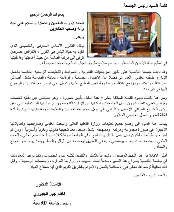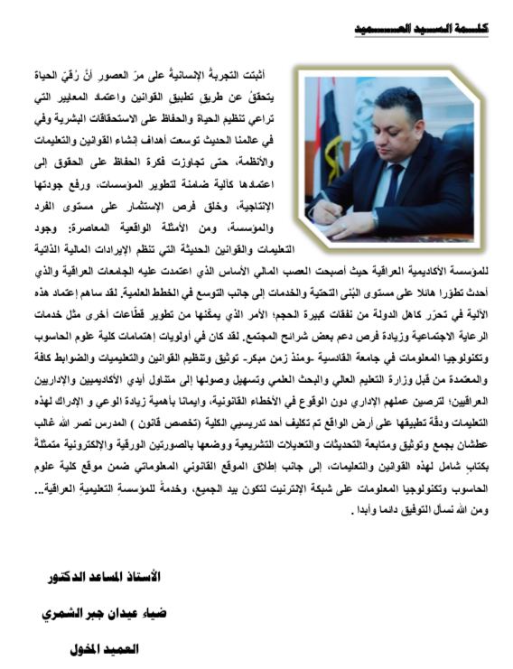 بالتوجيهات المباشرة للسيد رئيس جامعة القادسية الأستاذ الدكتور كاظم جبر الجبوري وبالمتابعة الخاصة من قبل السيد عميد كلية علوم الحاسوب وتكنولوجيا المعلومات الأستاذ المساعد الدكتور ضياء عيدان جبر الشمري يتحقق إنجازٌ نوعي جديد يضاف إلى إنجازات الكلية؛ بإنشاء موقعٍ قانوني معلوماتي يضم العديد من القوانين والتعليمات والضوابط المعتَمَدَة من قبل وزارة التعليم العالي والبحث العلمي ضمن موقع إلكتروني إحترافي على شبكة الإنترنيت خدمةً للمؤسسة التعليمية العراقية ليكون متاحا للأكاديميين والإداريين كافة في وزارة التعليم العالي والبحث العلمي وتشكيلاتها في الدوائر والجامعات والمعاهد العراقية.