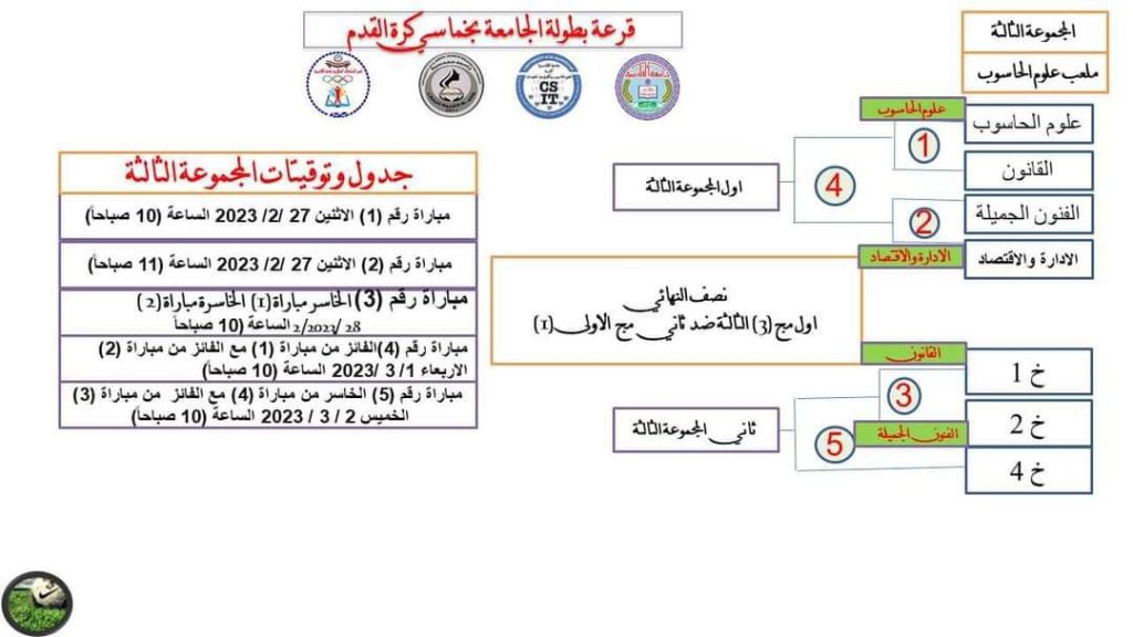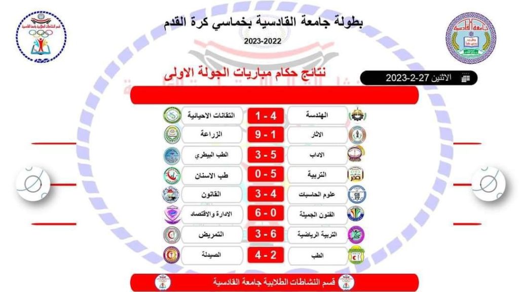 استضافت كلية علوم الحاسوب وتكنولوجيا المعلومات في جامعة القادسية بطولة الجامعة لكرة القدم؛ وانطلقت المباراة الأولى بين فريق الكلية وفريق كلية القانون وانتهت بفوز مستحق بنتيجة أربعة أهداف مقابل ثلاثة في مباراة صعبة اتّسمت بالقوة والمهارة العالية.