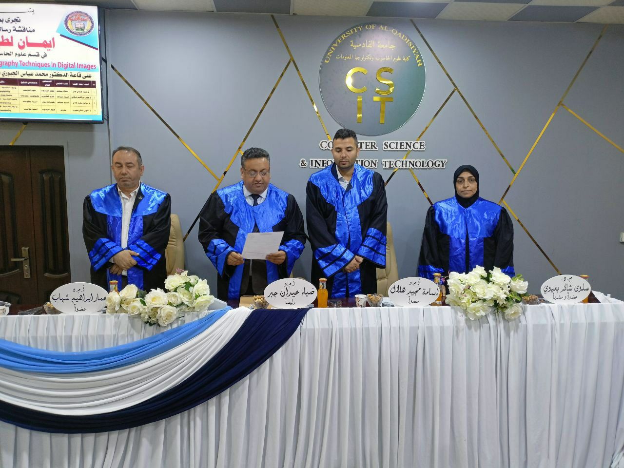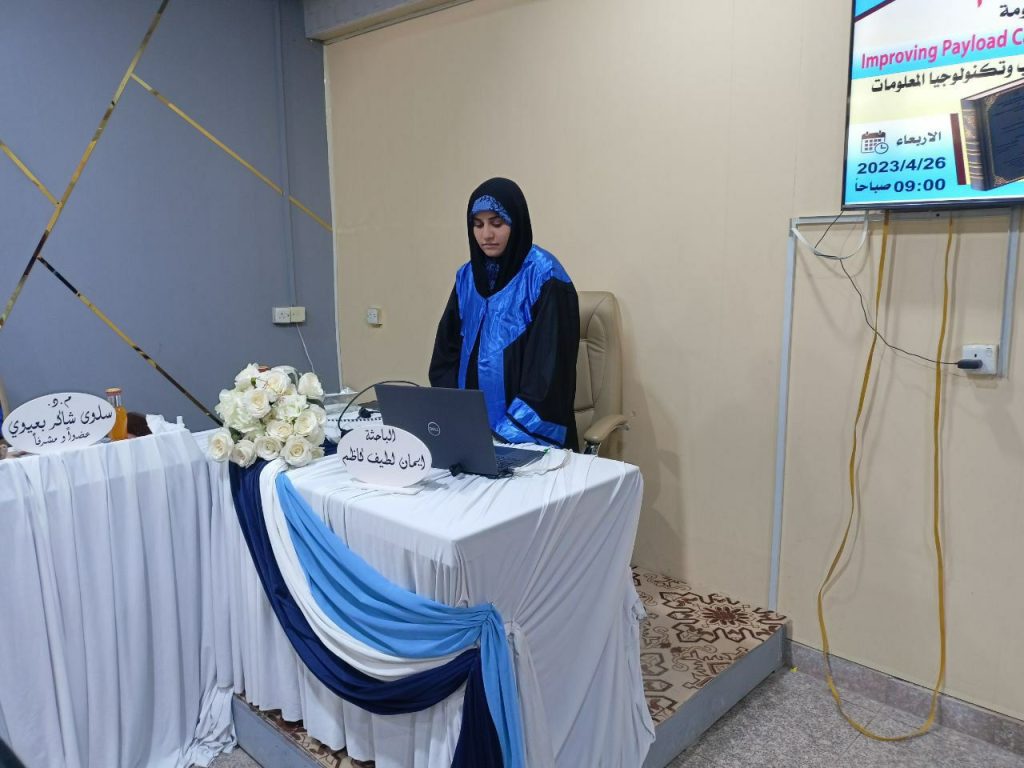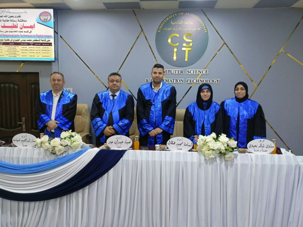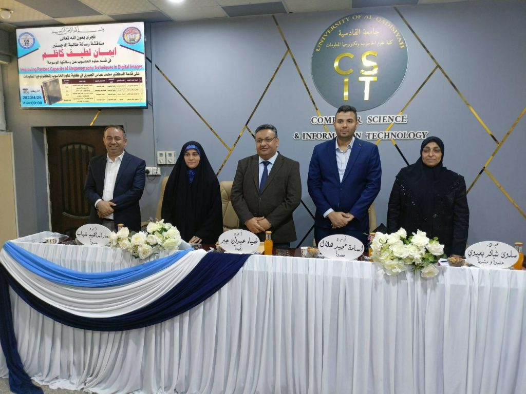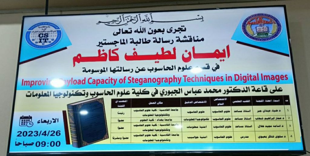 تمت مناقشة طالبة الماجستير إيمان لطيف كاظم عن رسالتها الموسومة ( Improving Payload Capacity of Steganography Techniques in Digital Images ) والمقدمة إلى مجلس كلية علوم الحاسوب وتكنولوجيا المعلومات /قسم علوم الحاسوب، على قاعة الدكتور محمد عباس الجبوري.
