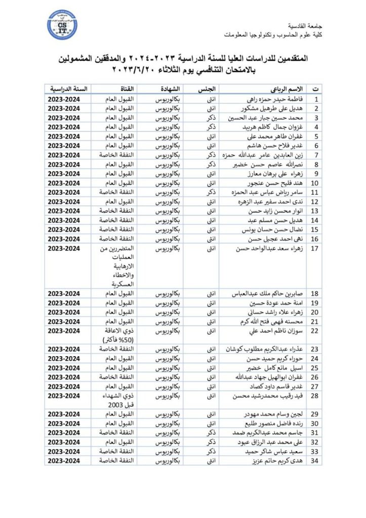 تعلن كلية علوم الحاسوب وتكنولوجيا المعلومات في جامعة القادسية عن أسماء المتقدمين للدراسات العليا درجة الماجستير في علوم الحاسوب للعام الدراسي ٢٠٢٣-٢٠٢٤ ممن اكتمل تدقيق ملفاتهم وشمولهم بالإمتحان التنافسي يوم الثلاثاء المقبل المصادف ٢٠/ ٦/ ٢٠٢٣ مستصحبين معهم الإثباتات الشخصية.