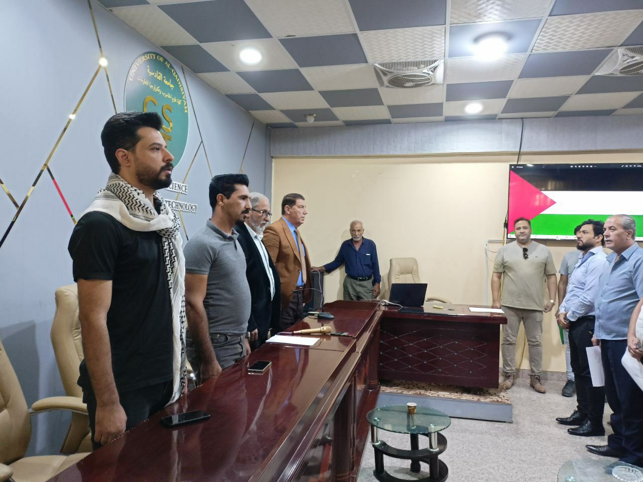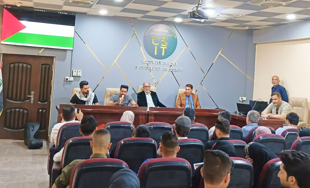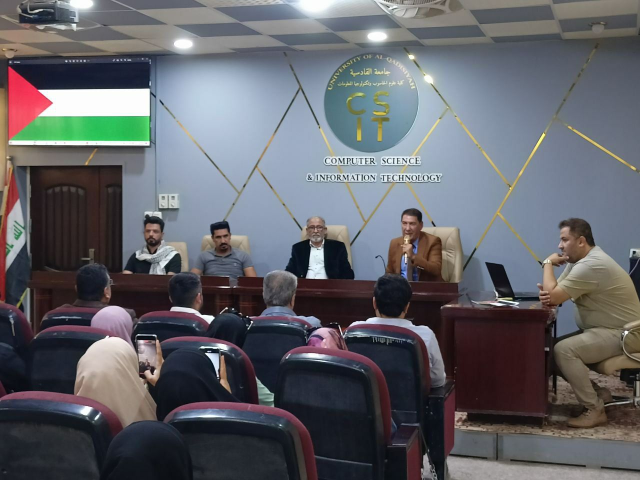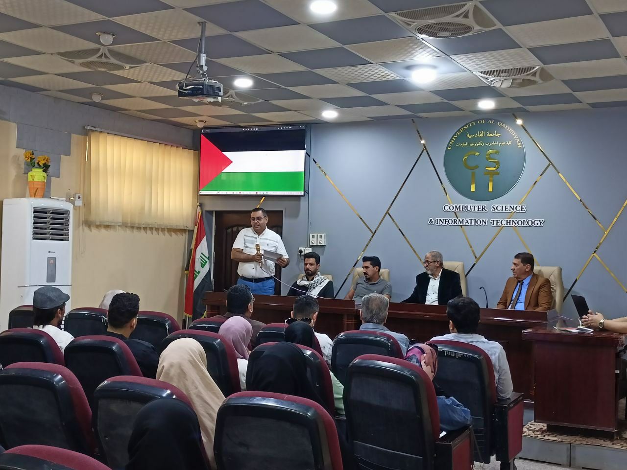 برعاية السيد رئيس جامعة القادسية الأستاذ الدكتور كاظم جبر الجبوري وبإشراف مباشر من قبل السيد عميد كلية علوم الحاسوب وتكنولوجيا المعلومات الأستاذ المساعد الدكتور مصطفى جواد رديف، وبمتابعة الأستاذ المساعد الدكتور ضياء عيدان جبر الشمري معاون العميد للشؤون العلمية، والدكتور أحمد محسن مهدي معاون العميد للشؤون الإدارية؛ أقامت وحدة أبحاث المعلوماتية في الكلية وعلى قاعة الدكتور محمد عباس الجبوري مهرجاناً شعرياً نصرةً لفلسطين وأبناء غزّة الصامدون تحت شعار (غزّة رمز العزّة)؛ استضافت فيه كل من: الشاعر معن غالب سباح، والشاعر فرقان كاظم، والفنان عبد الغفار جاسم محمد، والسيد حاكم رهيف جلاب.