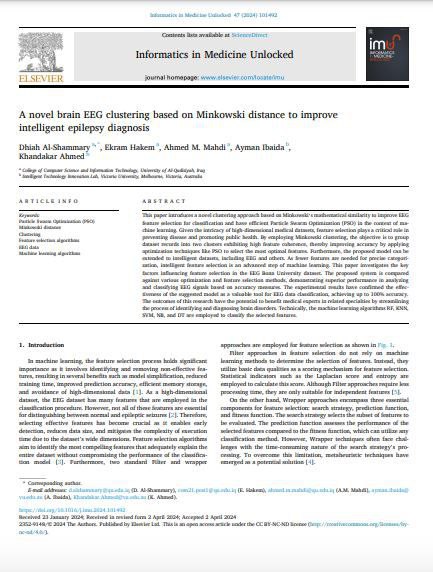 ضمن فريق عمل بحثي علمي بين كلية علوم الحاسوب وتكنولوجيا المعلومات بجامعة القادسية وفريق من الباحثين الاستراليين من جامعة فيكتوريا الاسترالية، نشر دراسة حديثة تتضمن تقنيات متطورة لتشخيص حالة الصرع باعتماد النبضات الدماغية حيث تم نشر الدراسة في مجلة المعلوماتية الطبية وهي احدى مجلات دار نشر اليسفير العالمية والمصنفة ضمن الربع الأول لمستوعبات سكوبوس التي تعد من ارفع معايير الرصانة. العلمية عالمياً