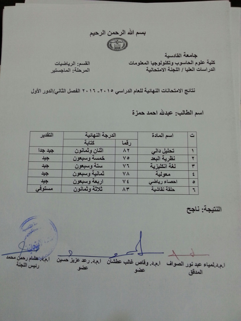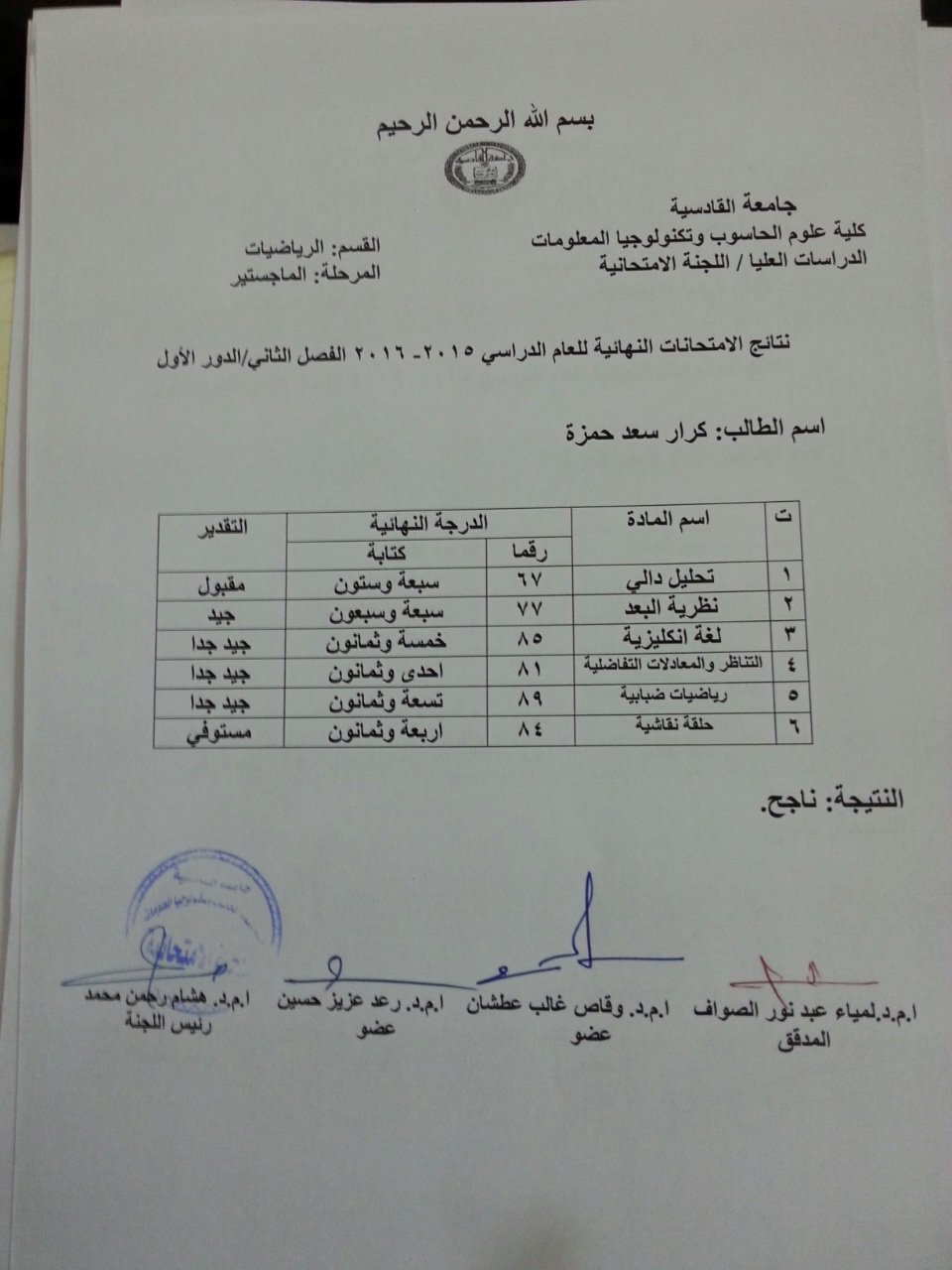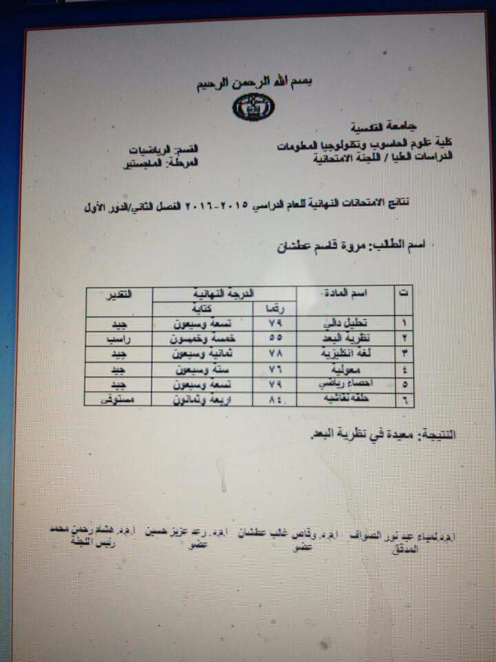 ندرج لكم ادناه نتائج طلبة الدراسات العليا / كلية علوم الحاسوب والرياضيات للفصل الثاني للعام الدراسي  2015/2016