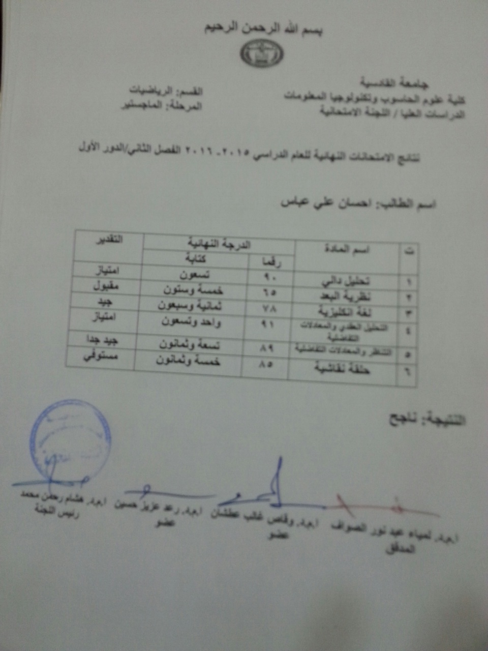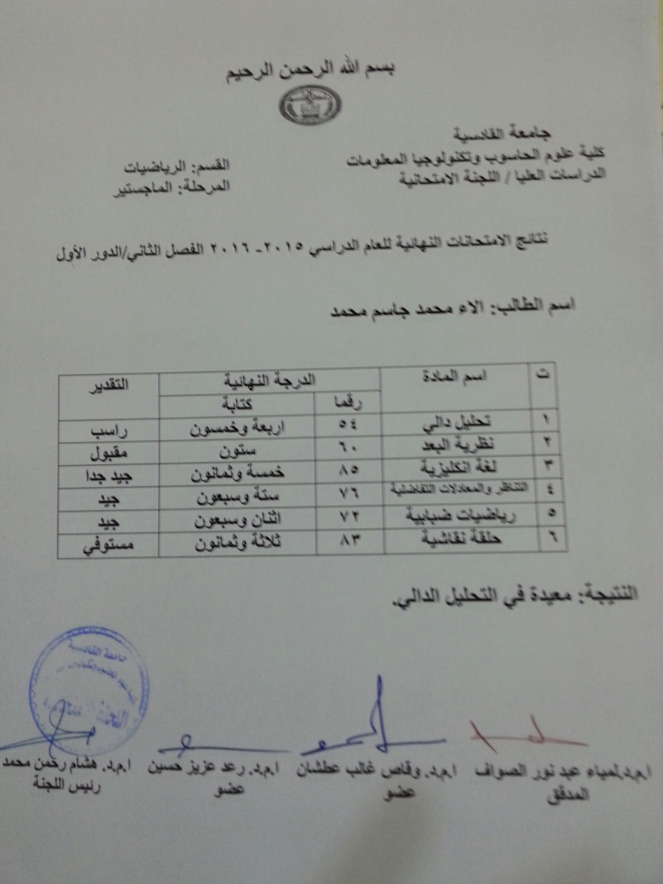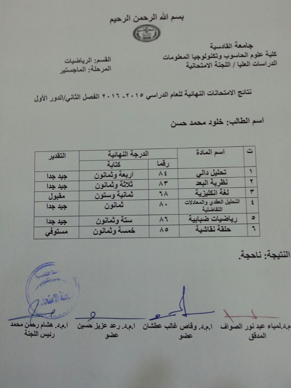 ندرج لكم ادناه نتائج طلبة الدراسات العليا / كلية علوم الحاسوب والرياضيات للفصل الثاني للعام الدراسي  2015/2016