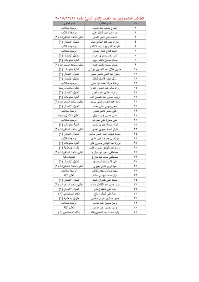 الى جميع الطلبة المدرجة اسمائهم في القوائم ادناه الذين لديهم (انذار نهائي ) مراجعة مقررية قسم الاحصاء والمعلوماتية لغرض التوقيع على تعهد خطي بعدم التغيب مرة اخرى وبخلافه سيتم فصل الطالب في حالة غيابه مرة اخرى …