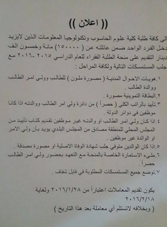 ملاحظة // سيتم رفع الاسماء المشمولة بالمنحة من خلال الموقع الالكتروني ….
