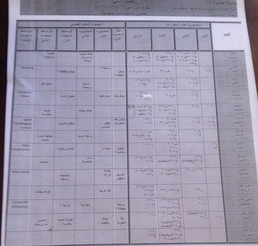 جدول الامتحانات النهائية للفصل الدراسي الثاني / للعام الدراسي 2016/2017