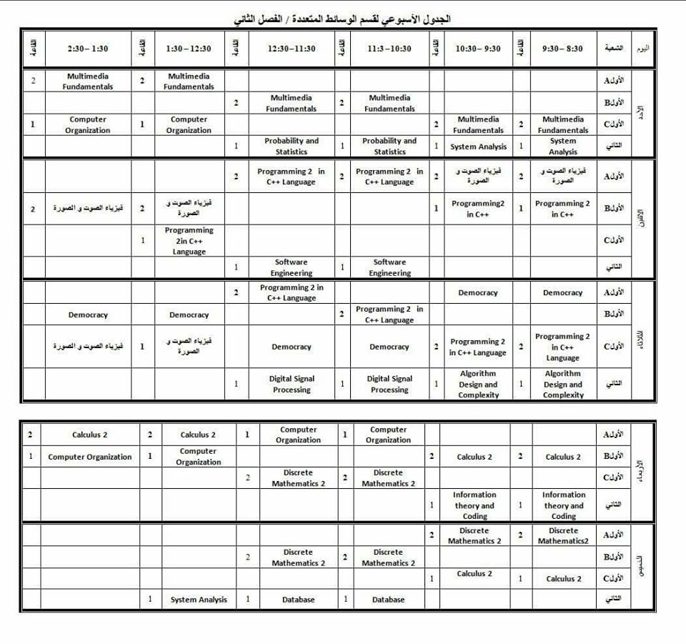 الجدول الاسبوعي لقسم الوسائط المتعددة // الفصل الثاني
