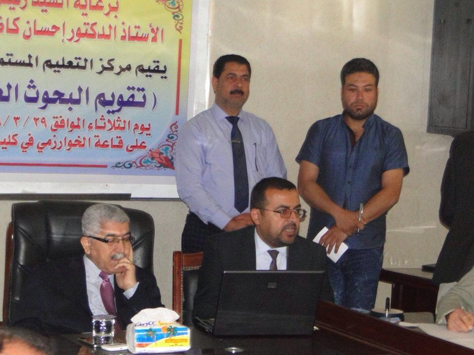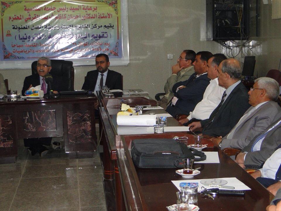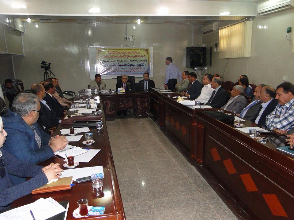 برعاية السيد رئيس جامعة القادسية الاستاذ الدكتور احسان القرشي المحترم أقيمت اليوم الثلاثاء المصادف ٢٩-٣-٢٠١٦ ورشة عمل بعنوان (تقييم البحوث العلمية إلكترونيا) وبإشراف مركز التعليم المستمر في رئاسة جامعة القادسية وفي قاعة التشاورالمرئي/ كلية علوم الحاسوب وتكنولوجيا المعلومات حيث تم القاء المحاضرة الاولى من قبل السيد رئيس جامعة القادسية ا.د.احسان القرشي المحترم حيث بين سيادته اهمية نشر وتقيم البحوث العلمية الكترونيا واهمية الحوكمة والمكننة الالكترونية بصورة عامة والارتقاء بجامعتنا العزيزة إلى مصاف الجامعات العالمية من خلال استخدام افضل الطرق لتقييم البحوث.وكذلك تم القاء المحاضرة الثانية من قبل السيد معاون العميد للشؤون العلمية أ.م .د وقاص غالب عطشان وبحضور السادة رؤوساء ومدراء تحرير المجلات العلمية في جامعة القادسية وأعضاء من لجان الترقيات العلمية للكليات.