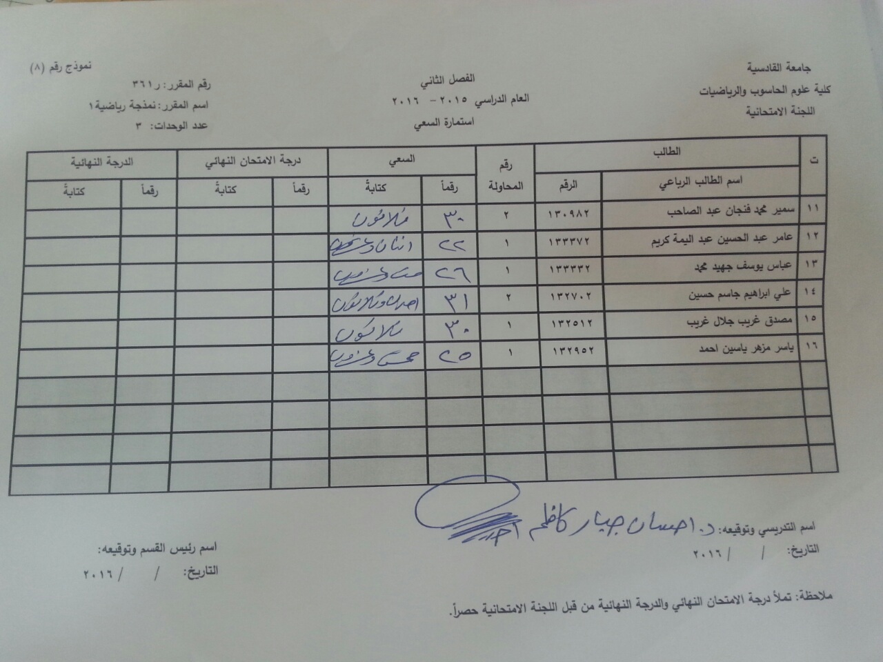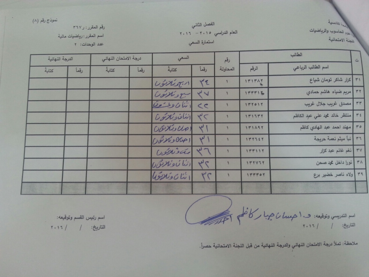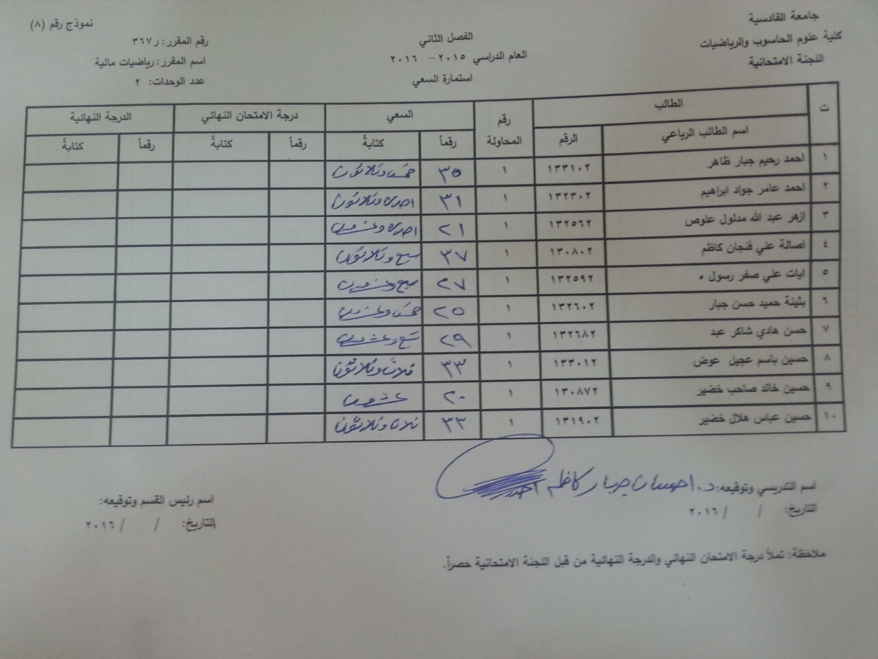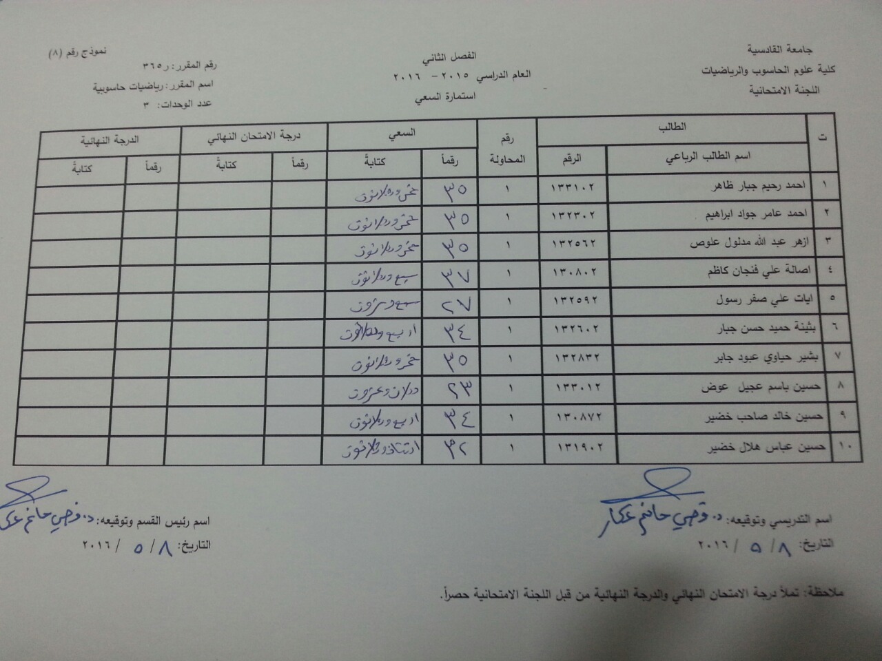 سعي مواد قسم الرياضيات (رياضيات حاسوبية -تحليل عقدي 2-تحليل عقدي 1-نظرية التقريب -احتمالية -انترنت وانترانيت -مبادئ ادارة -تحليل دالي 2 -تحليل دالي 1 -نظرية القياس -تبلوجيا – جبر خطي – نمذجة رياضية – نظرية الفوظى – رياضيات مالية )