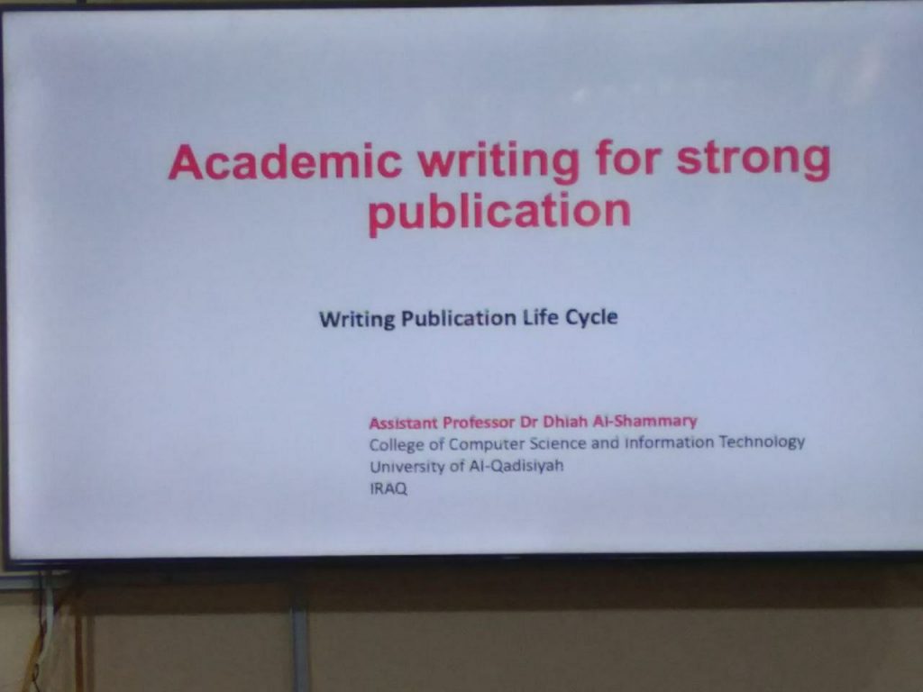 The advanced scientific workshop on academic writing and research skills commenced today, Sunday, June 25, 2023, at the College of Computer Science and Information Technology, Al-Qadisiyah University. The workshop was conducted by Assistant Professor Dr. Dhiah Al-Shammary and will continue after the Eid Al-Adha holiday for four days, including four high-quality lectures that cover various aspects of scientific research requirements and professional academic writing techniques.