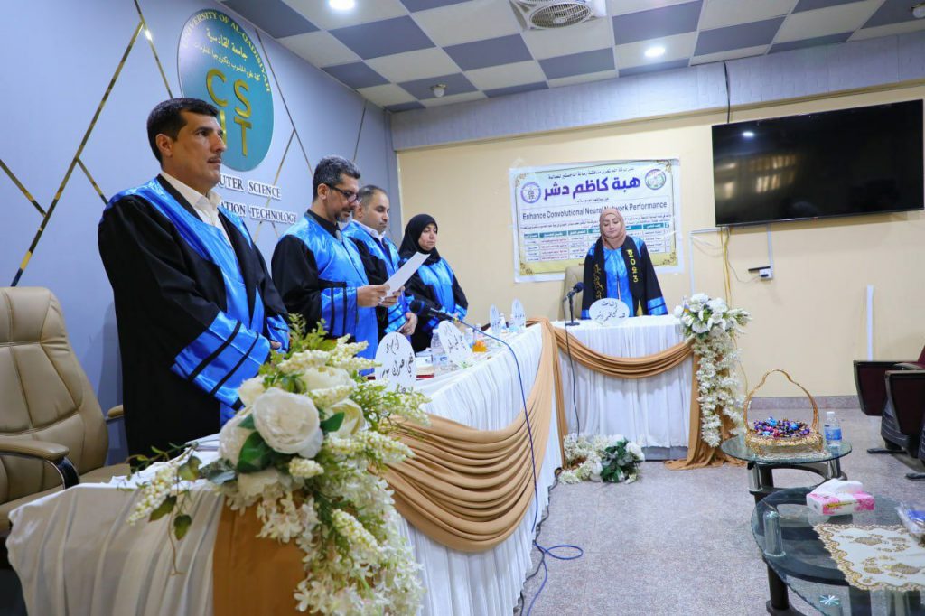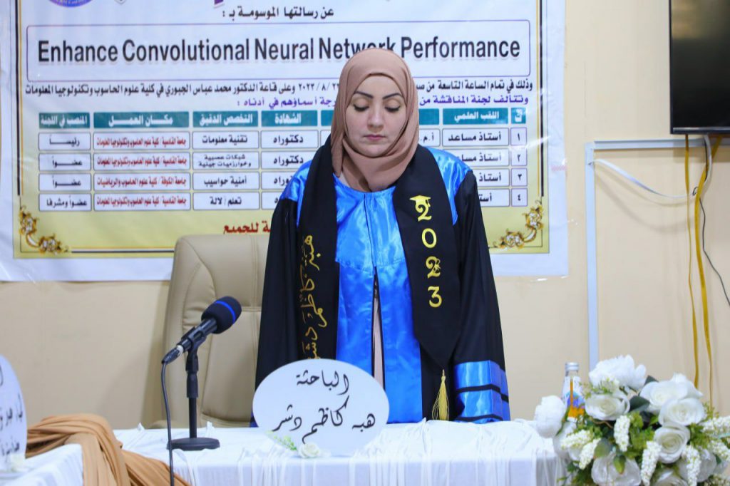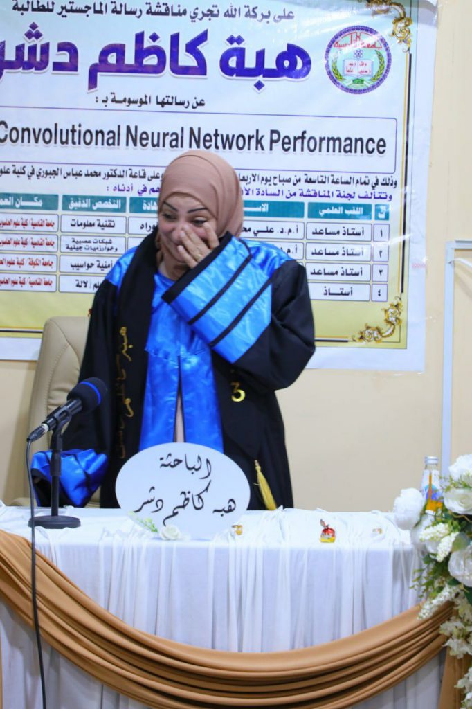 The thesis titled “Improving Performance of Convolutional Neural Networks” was presented by the master’s student Heba Kazem Dashr under the supervision of Professor Dr. Lamiaa Abdul Noor Mohammed.